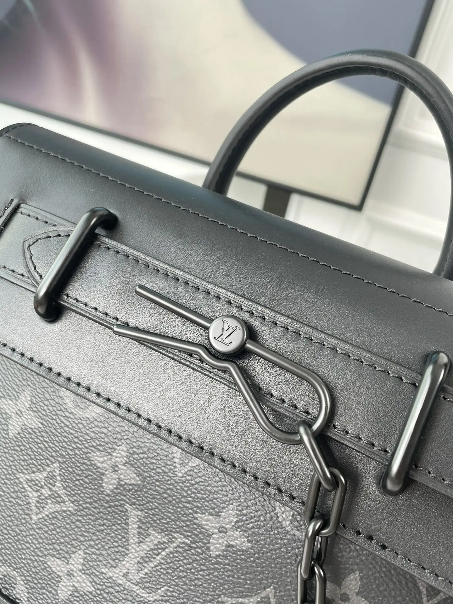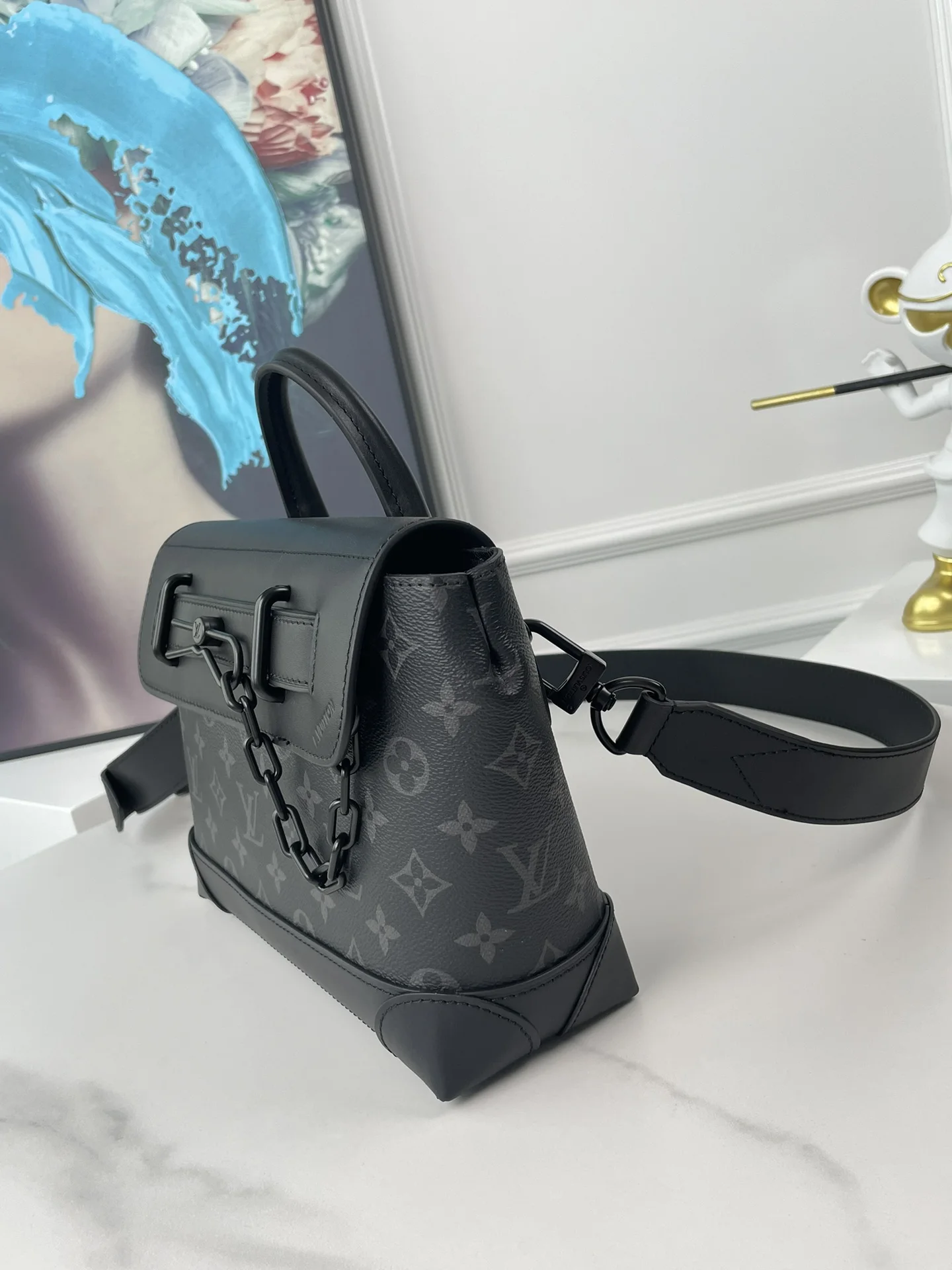 海外原单M46953独家实拍 本款 Steamer 小号手袋结合摩登巧思和传统素 向路易威登的 Steamer 行李箱采撷灵感 为 Monogram Eclipse 帆布点缀硬箱风格包角以及经典链条和饰针搭扣 实用构型成就潮流佳选 尺寸 25×19×8cm