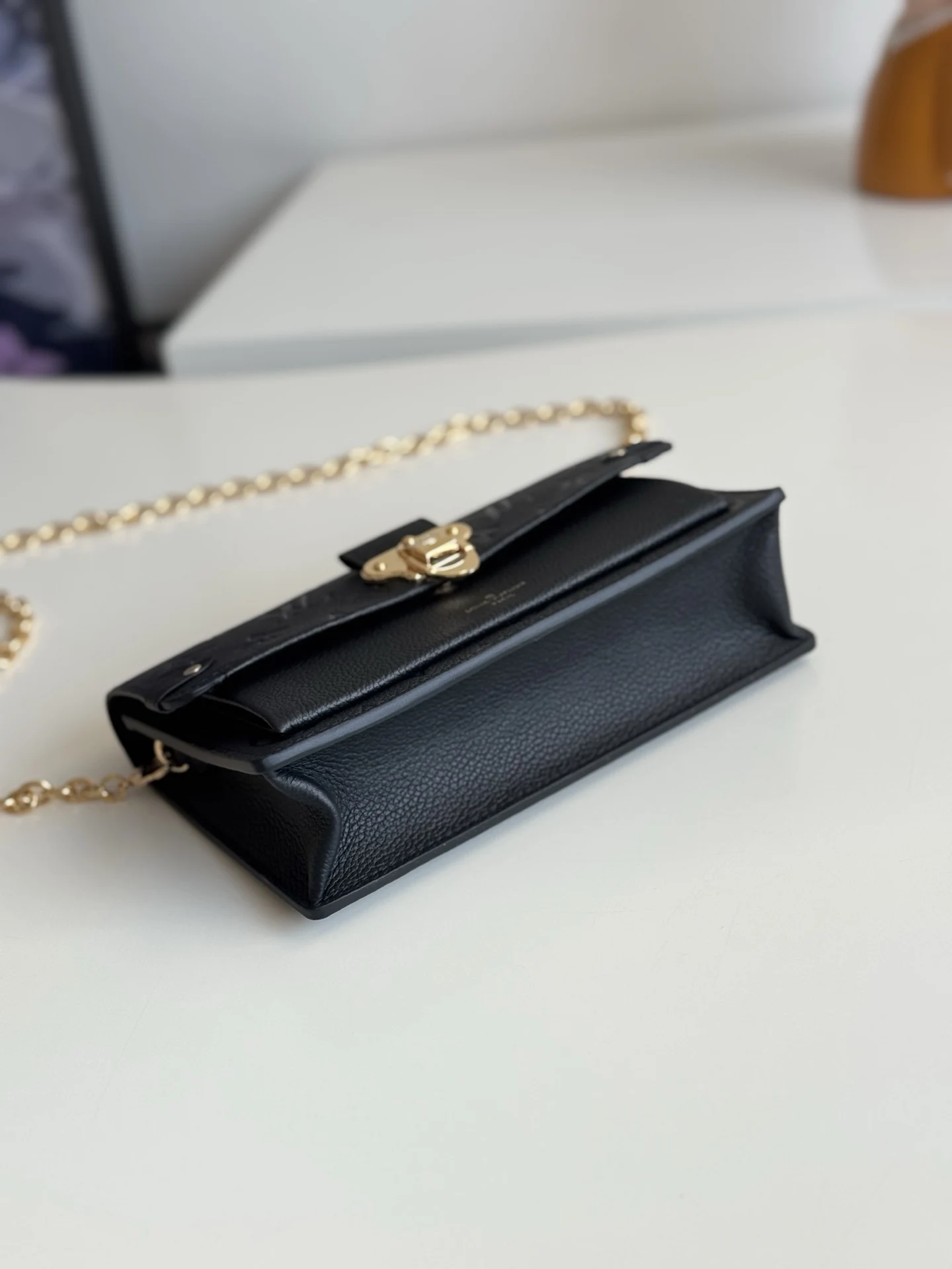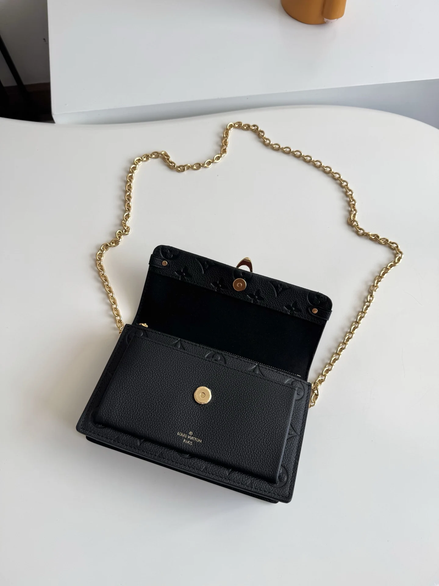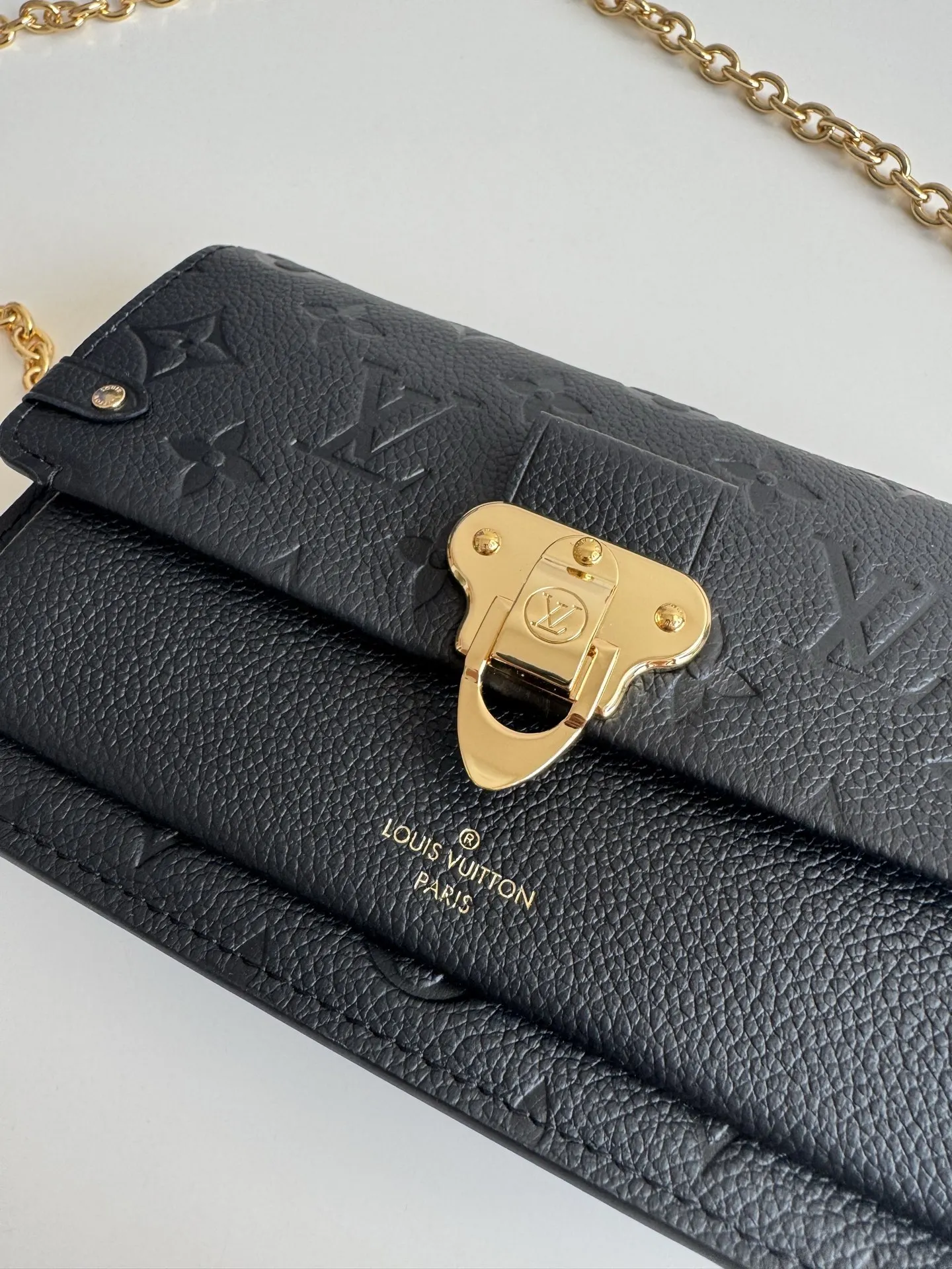 海外原单M67839黑色独家实拍 此款 Vavin 夹采用 Monogram Empreinte 皮革 锁饰源于路易威登硬箱 细腻的压纹印花与链条包袋造型相辅相成 前袋处印有路易威登英文字样 可存放一部手机 内袋与隔层便于取放物品 尺寸 19×12.5×4cm