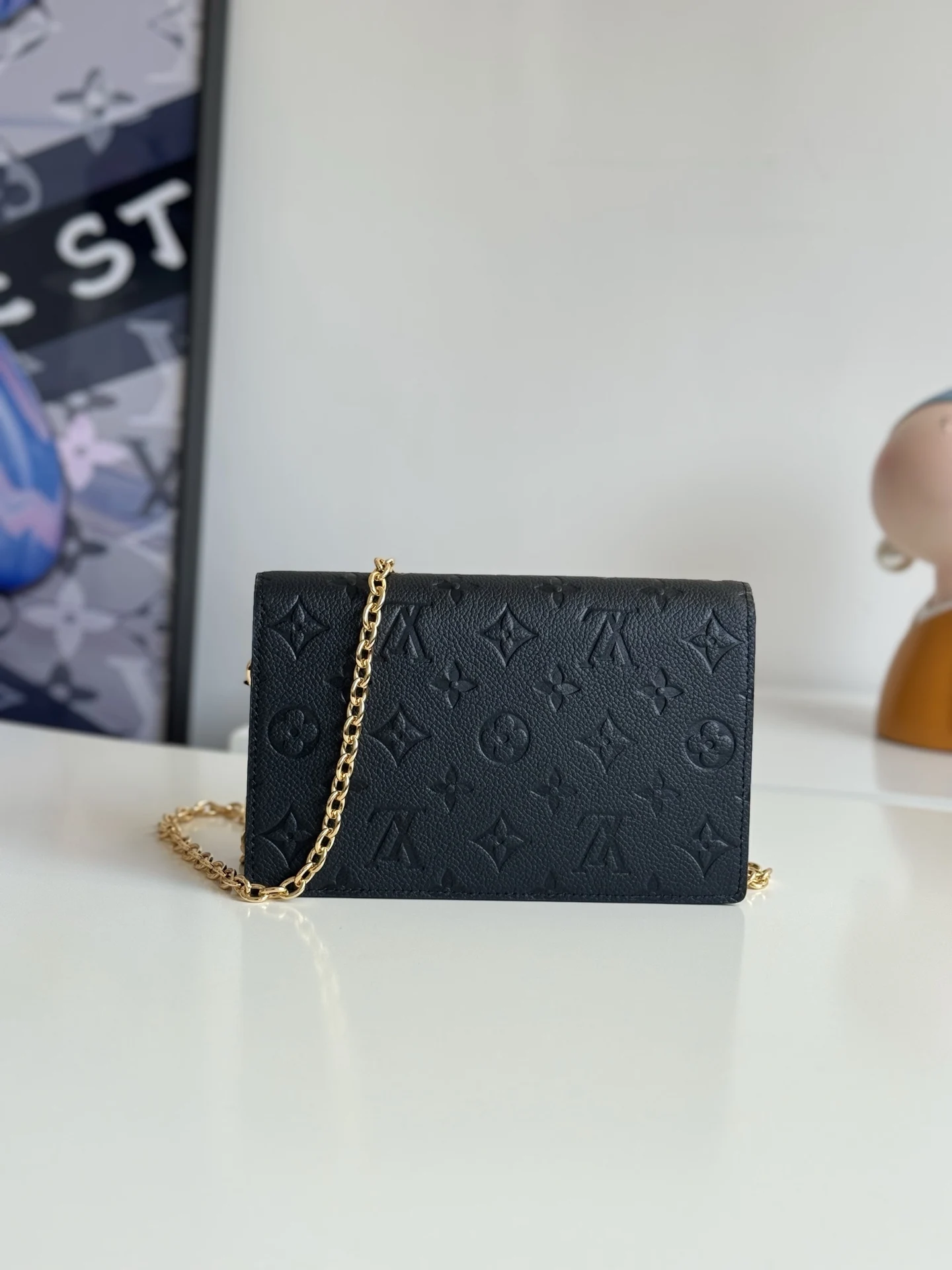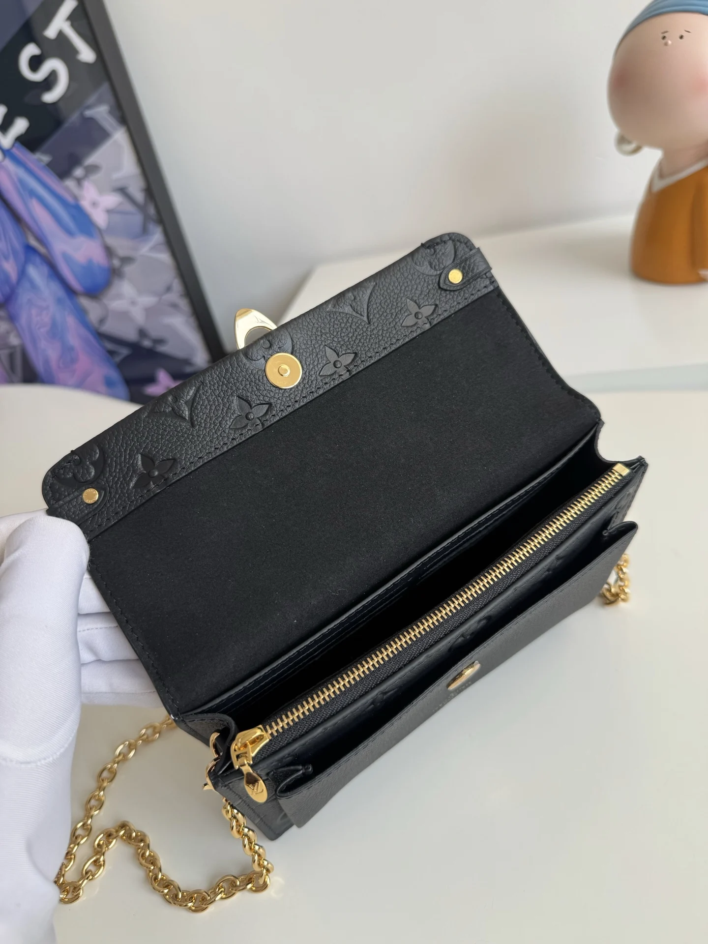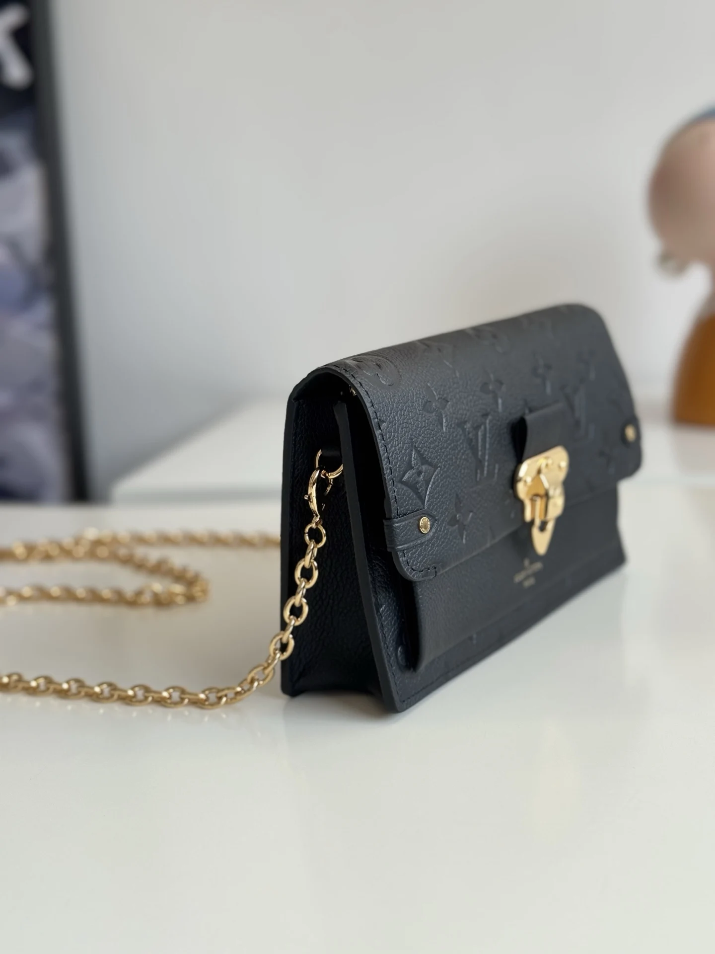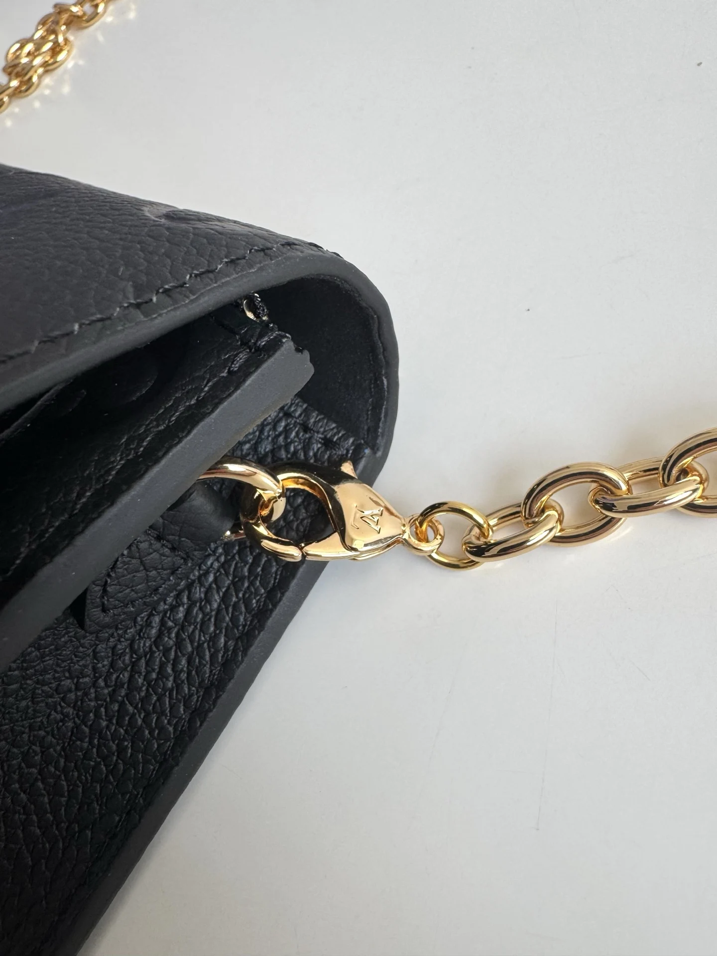 海外原单M67839黑色独家实拍 此款 Vavin 夹采用 Monogram Empreinte 皮革 锁饰源于路易威登硬箱 细腻的压纹印花与链条包袋造型相辅相成 前袋处印有路易威登英文字样 可存放一部手机 内袋与隔层便于取放物品 尺寸 19×12.5×4cm