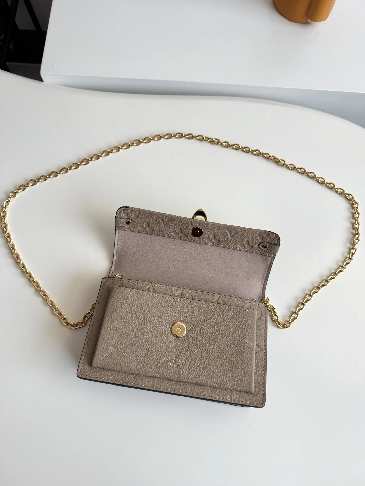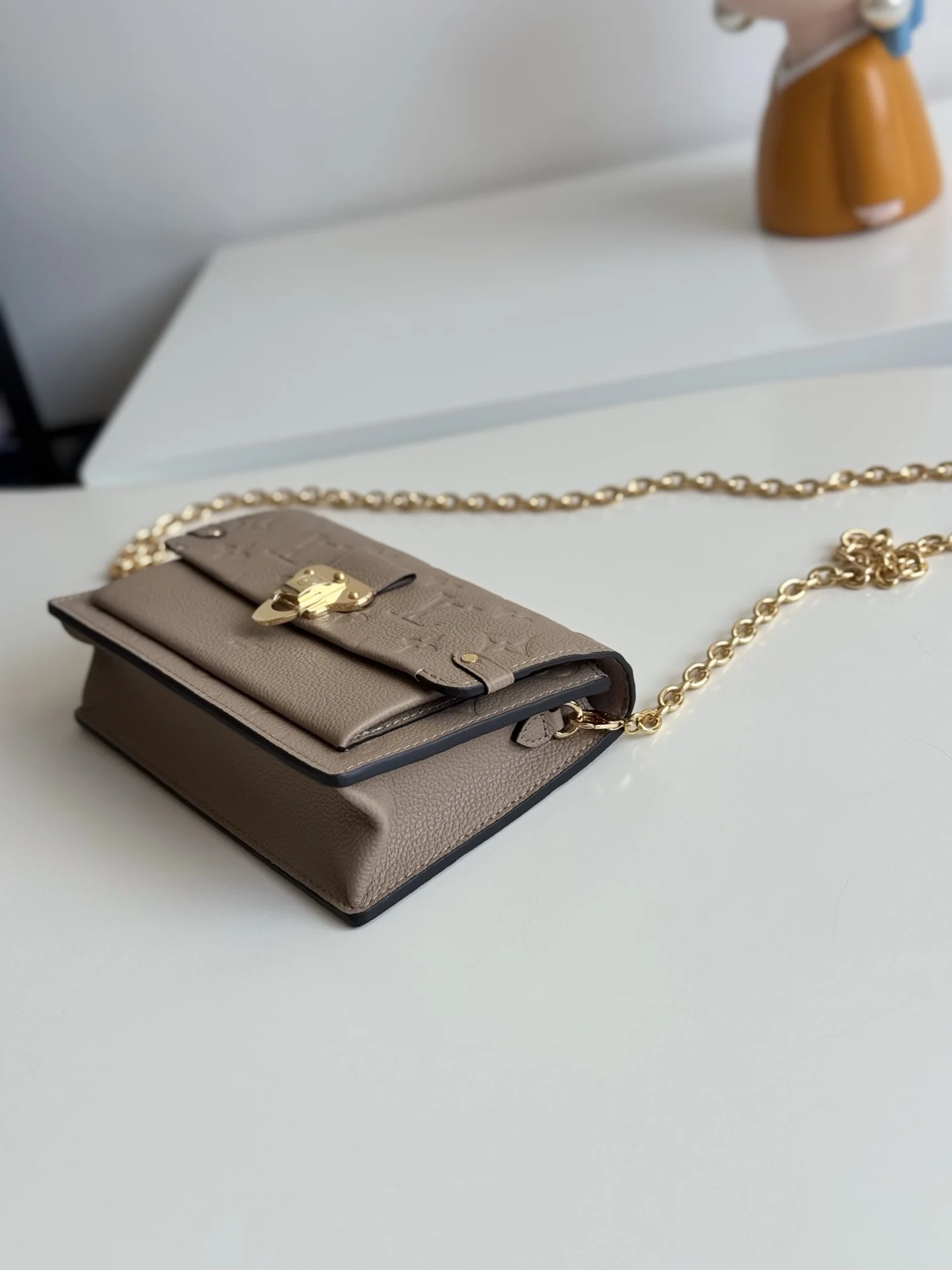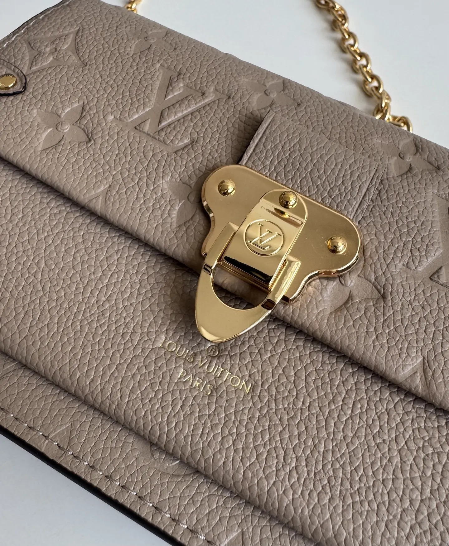 海外原单M69423杏色独家实拍 此款 Vavin 夹采用 Monogram Empreinte 皮革 锁饰源于路易威登硬箱 细腻的压纹印花与链条包袋造型相辅相成 前袋处印有路易威登英文字样 可存放一部手机 内袋与隔层便于取放物品 尺寸 19×12.5×4cm