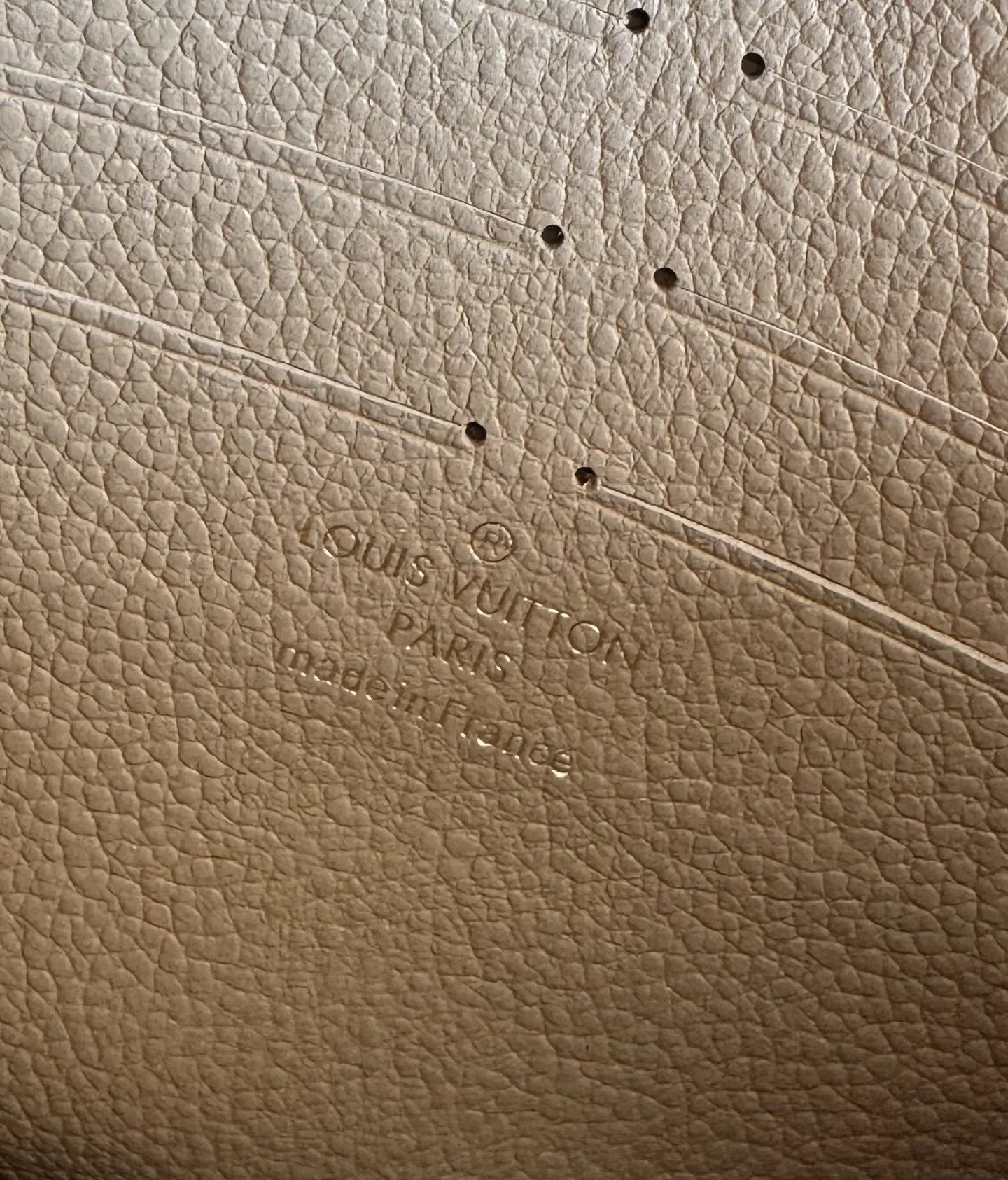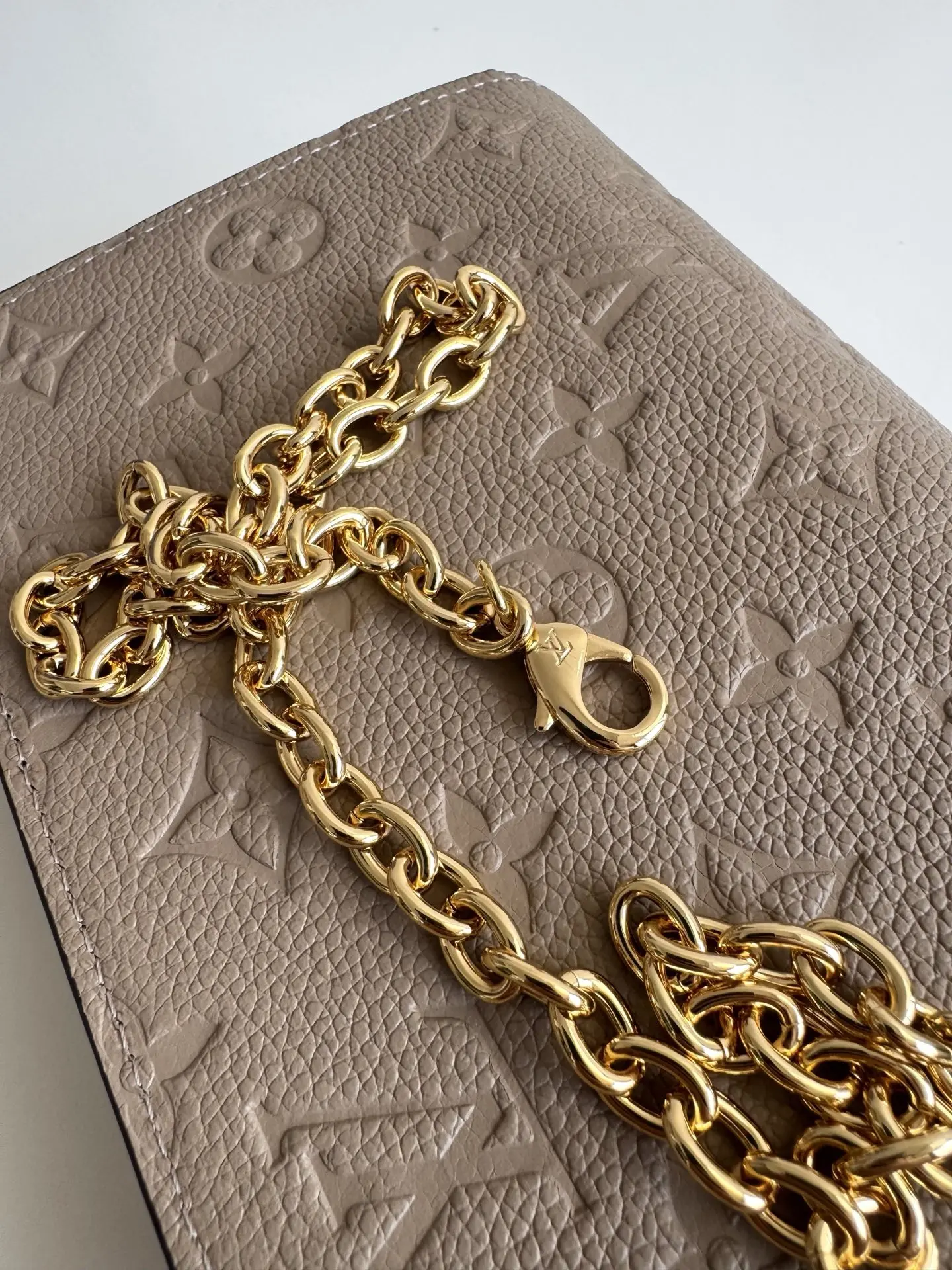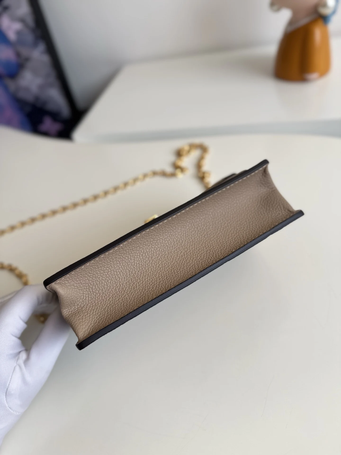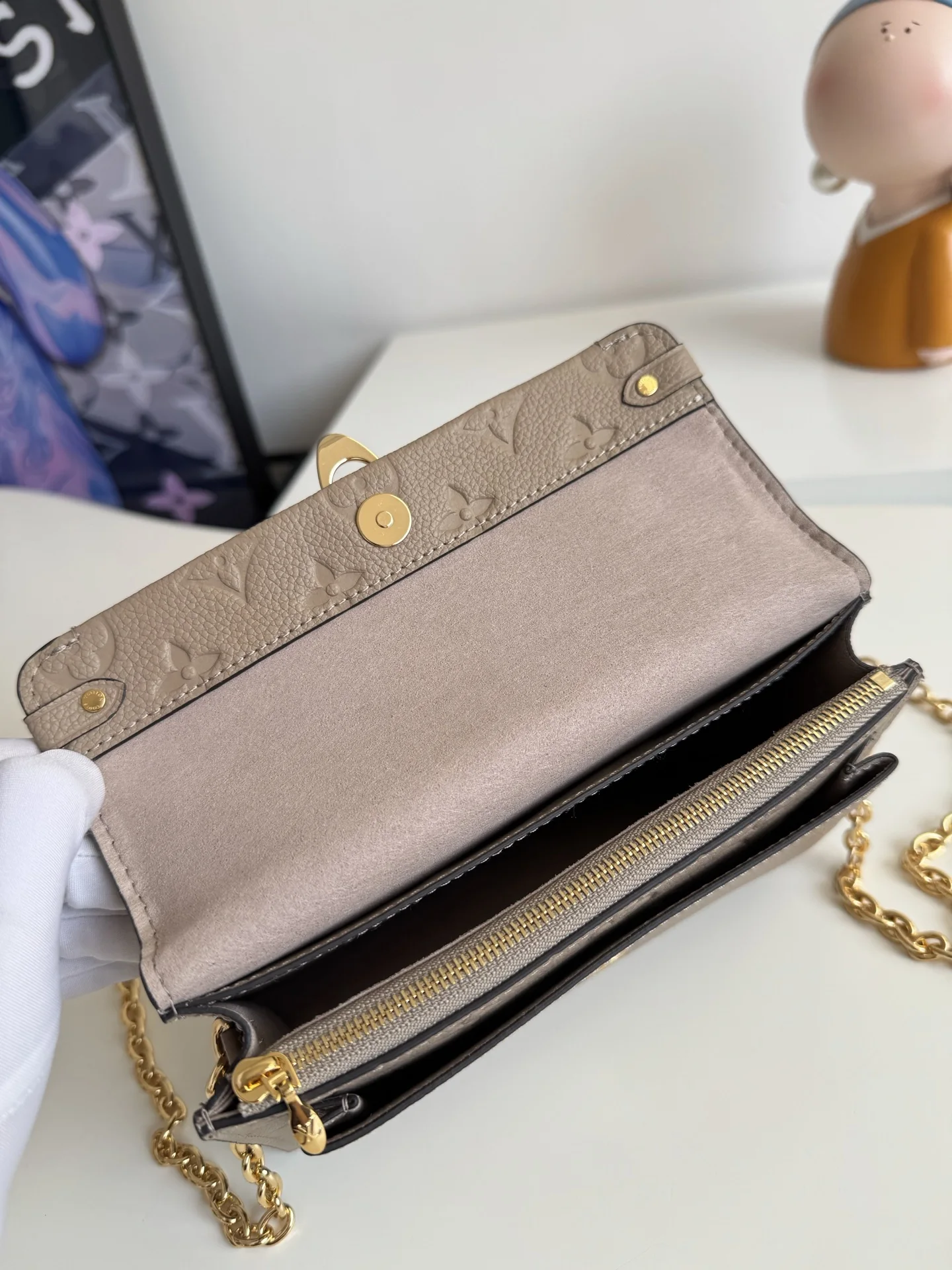 海外原单M69423杏色独家实拍 此款 Vavin 夹采用 Monogram Empreinte 皮革 锁饰源于路易威登硬箱 细腻的压纹印花与链条包袋造型相辅相成 前袋处印有路易威登英文字样 可存放一部手机 内袋与隔层便于取放物品 尺寸 19×12.5×4cm