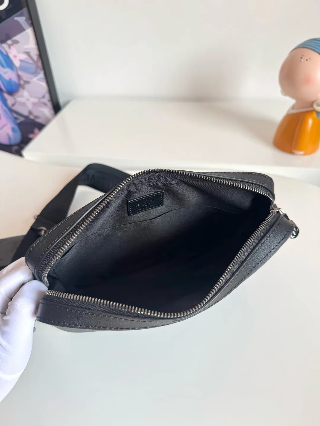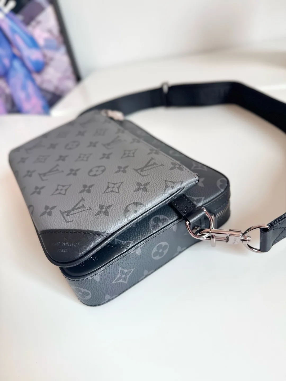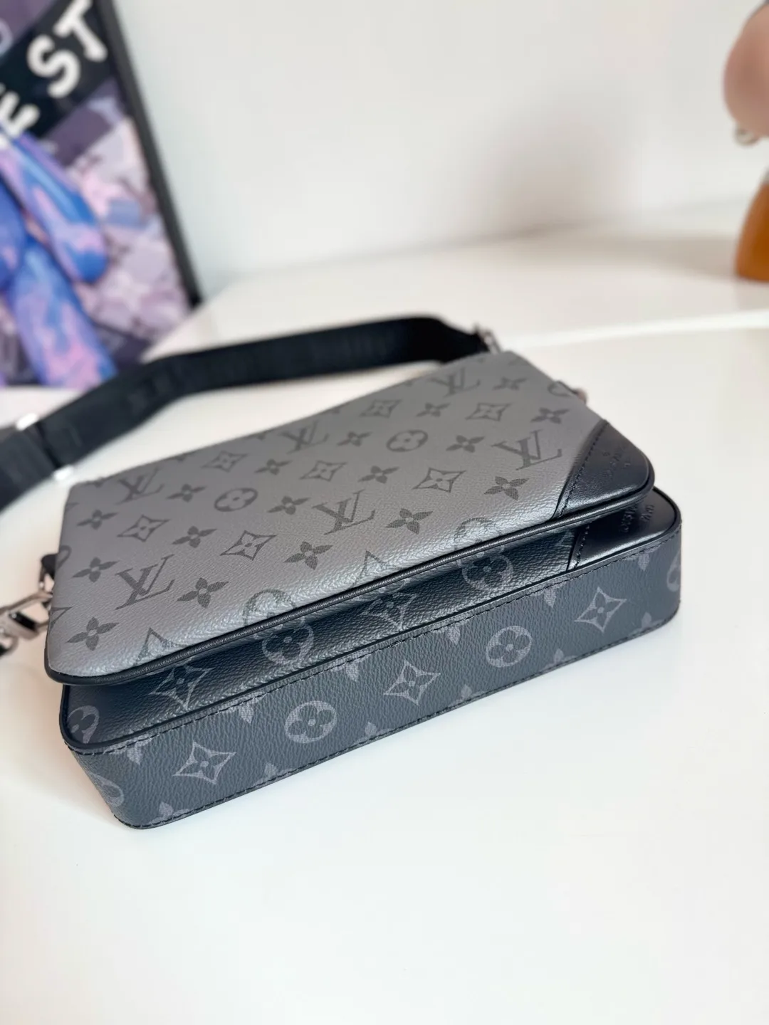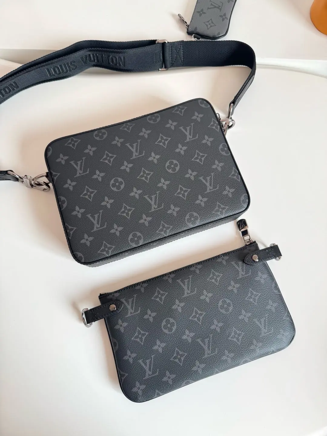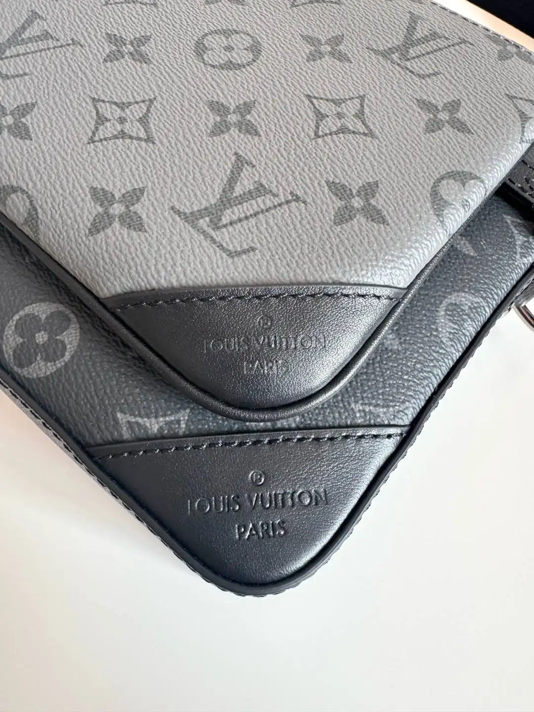 海外原单M69443独家实拍 Trio 邮差包由 Monogram Eclipse 帆布与 Monogram Eclipse Reverse 帆布制成 标志性的同色调灰色图案凸显此多功能拼搭设计品的线条 除具备传统斜跨手袋的功能外 另配可脱卸拉链袋和附于包带上的零包 尺寸 25×18.5×7cm