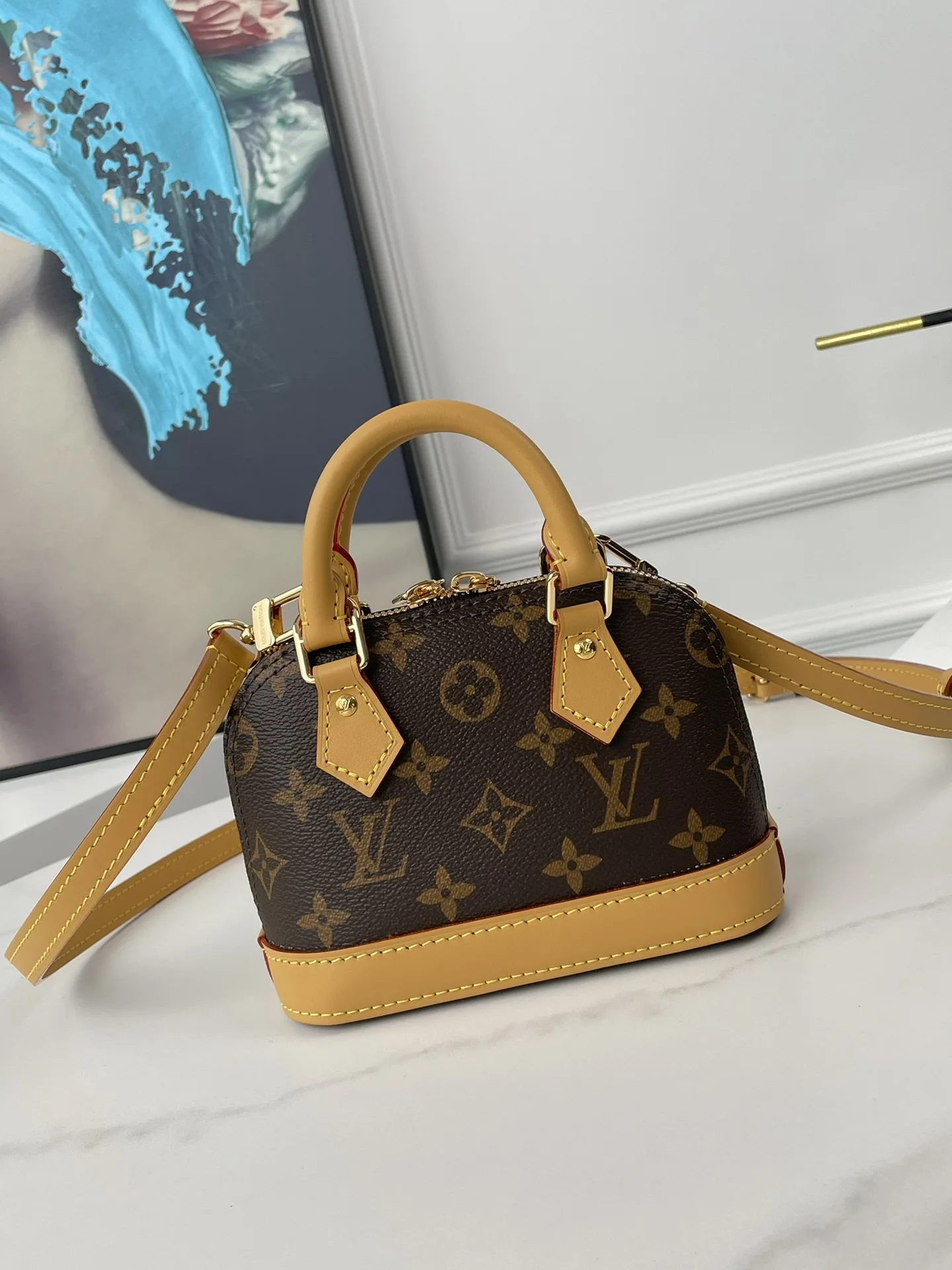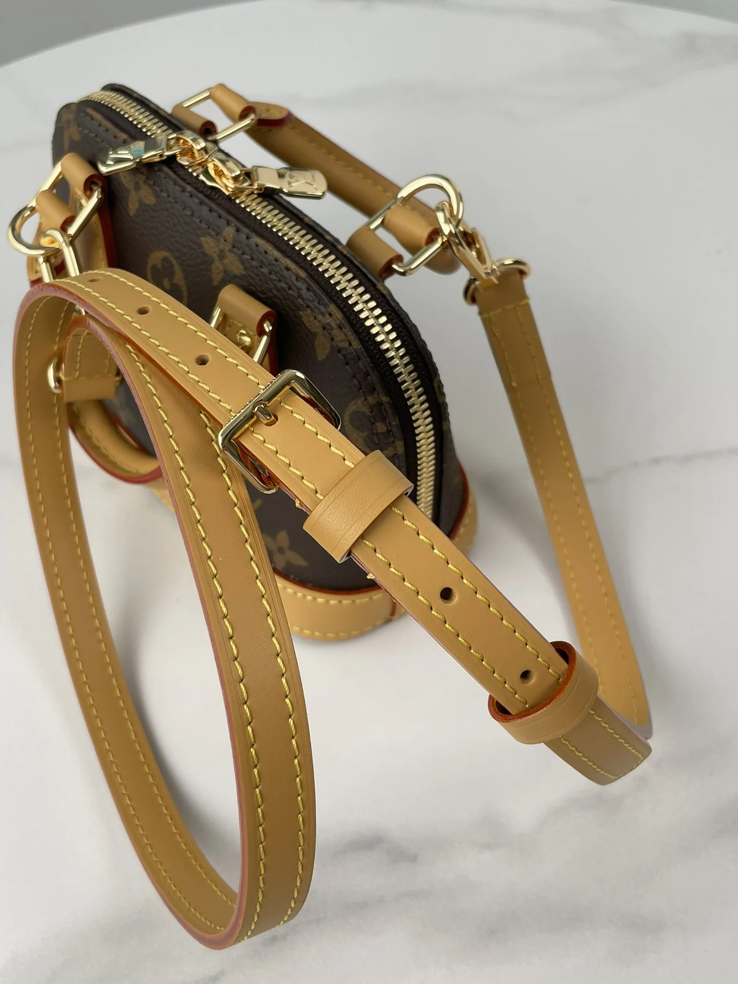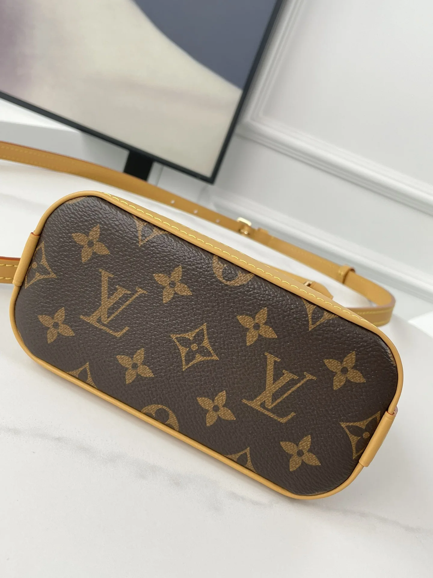 海外原单M82717独家实拍 本款 Nano Alma 手袋浓缩 Alma 手袋的经典构型 为 2024 早春秀场的 Monogram Dune 帆布勾勒皮革饰边 精巧手柄和可拆卸并调节的肩带实现多种背携方式 尺寸 18×12×8cm