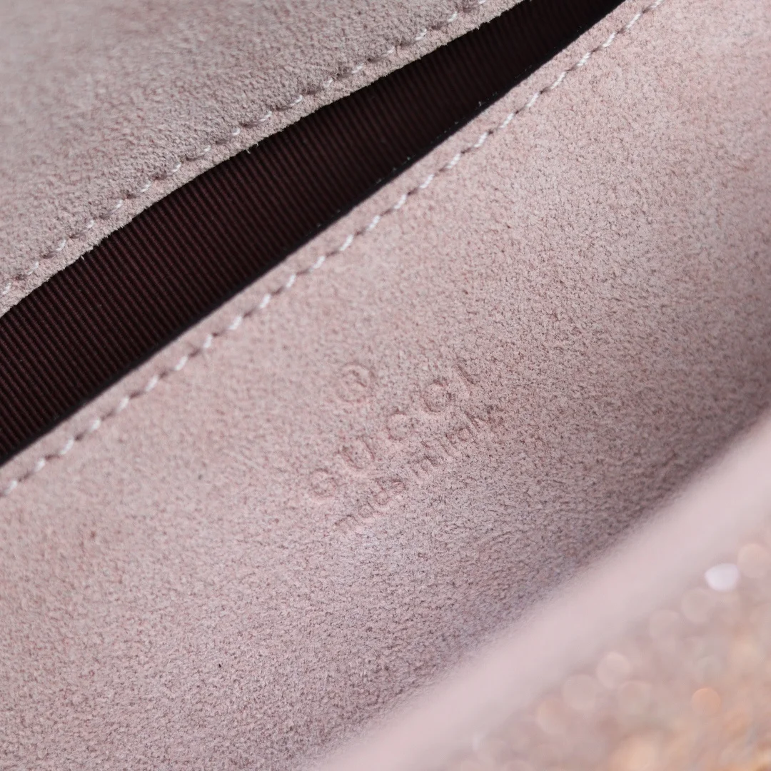 马蒙系列复古底蕴 标志性双G徽章之上 满铺手工甄选的璀璨亮钻 在光线下折射出流动星河般的夺目光彩 型号 837280