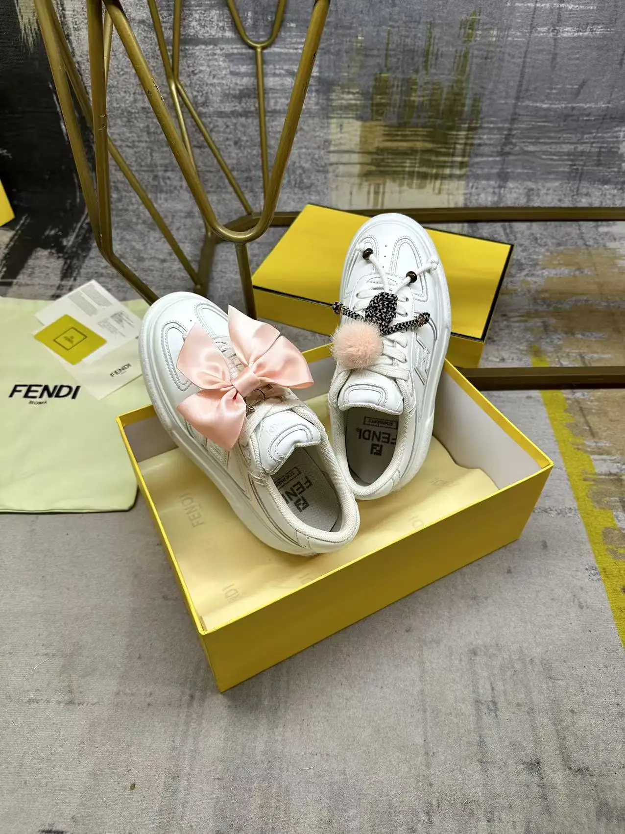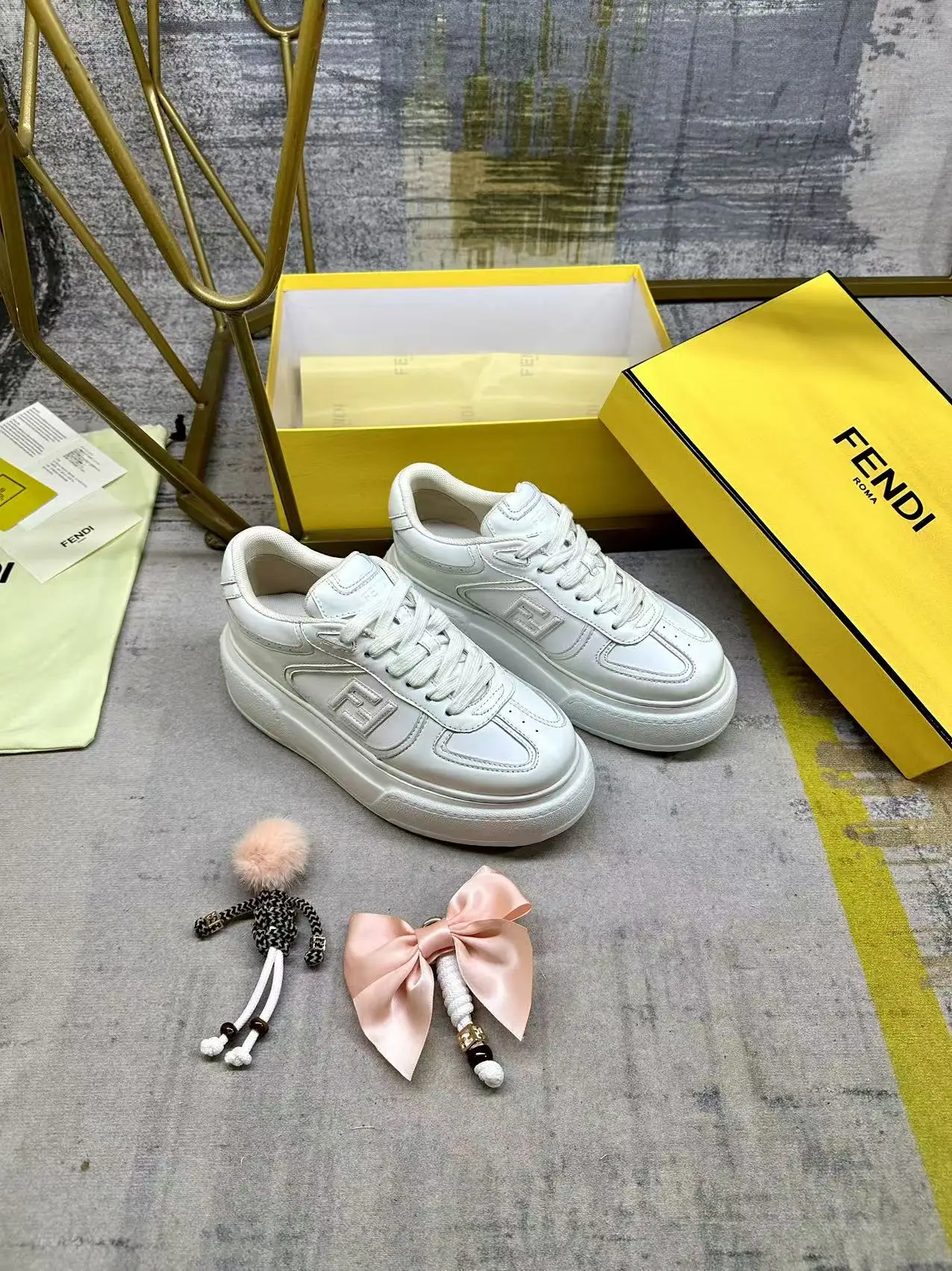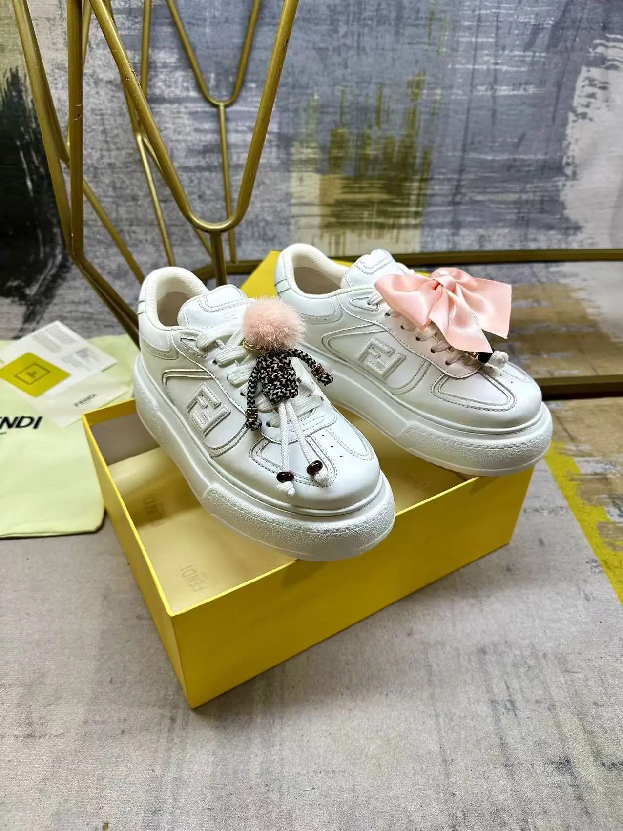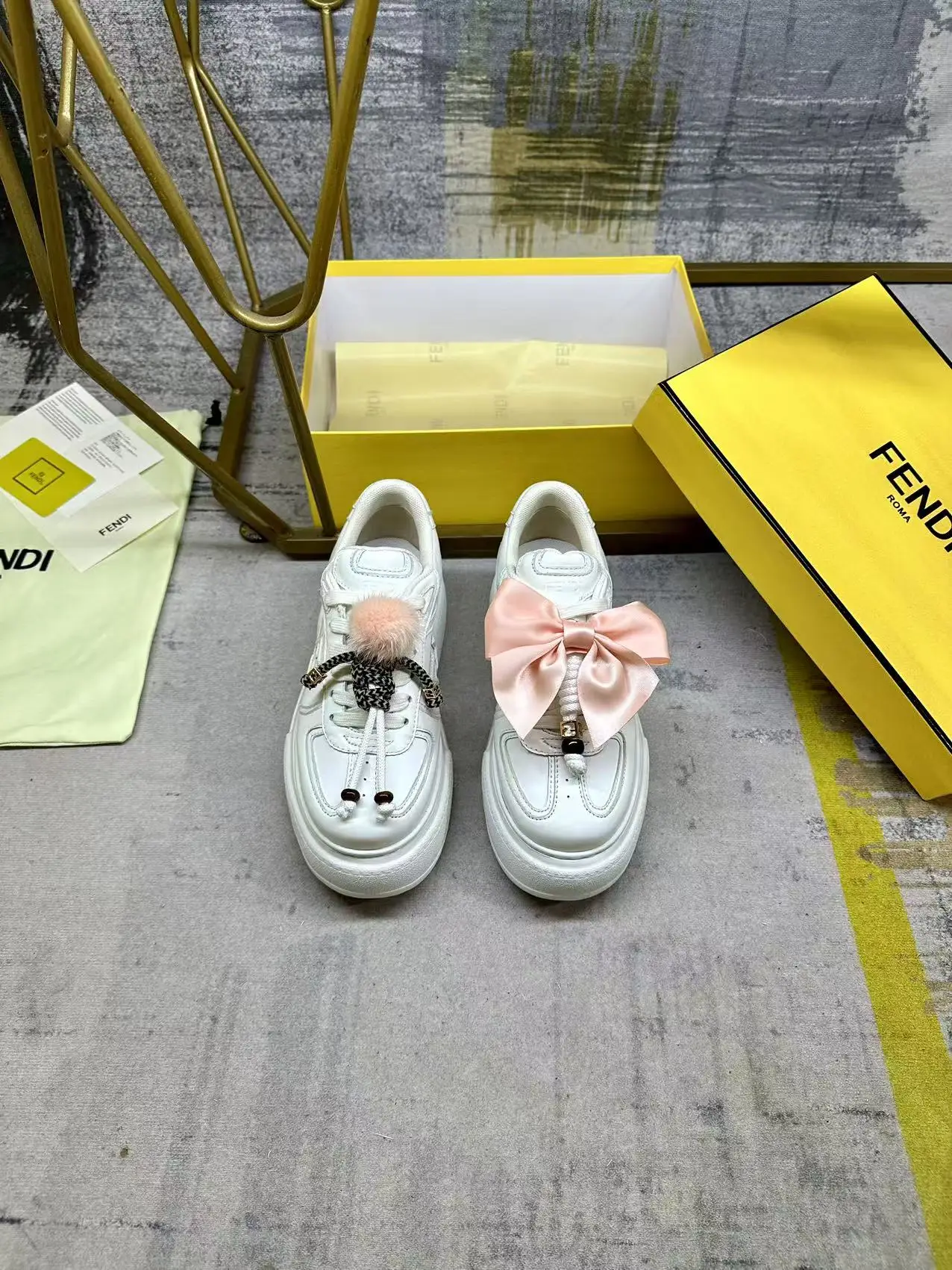 FENDI Match系带运动鞋 白色皮革材质 侧面饰有同色系皮革FF贴花 配白色鞋带 橡胶厚鞋底 后跟处饰有超大凸纹FENDI字样 鞋舌上饰有金属环挂饰 右鞋上饰有带粉红色貂皮细节和金色金属FF图案手链的编绳小玩偶 左鞋上饰有配白色和粉红色绳索的大号粉红色塔夫绸蝴蝶结和金色金属FF和树脂玳瑁效果珠饰 玩偶可拆卸 35-42码