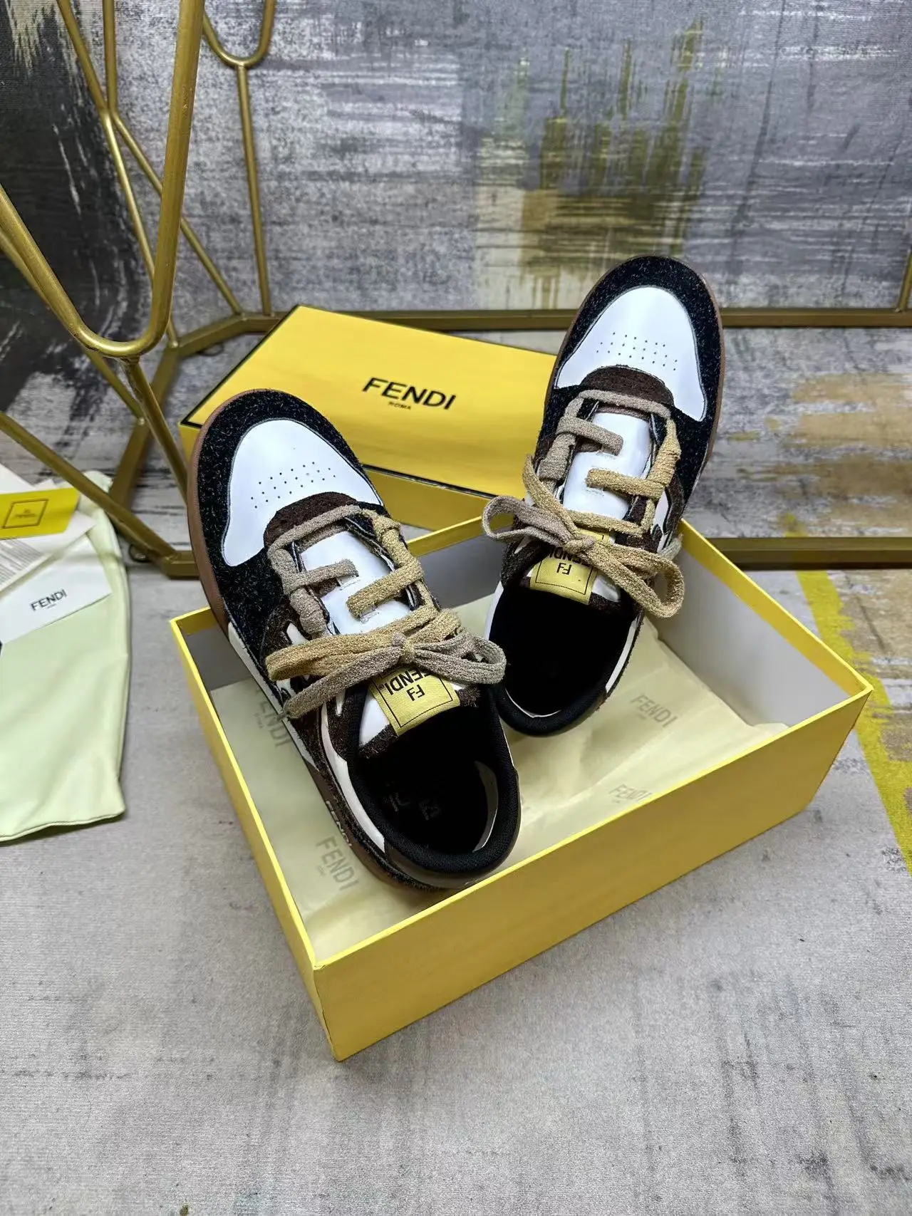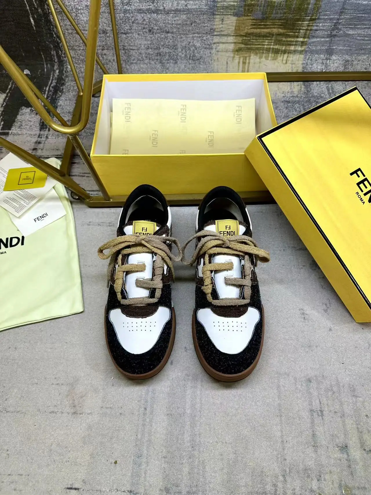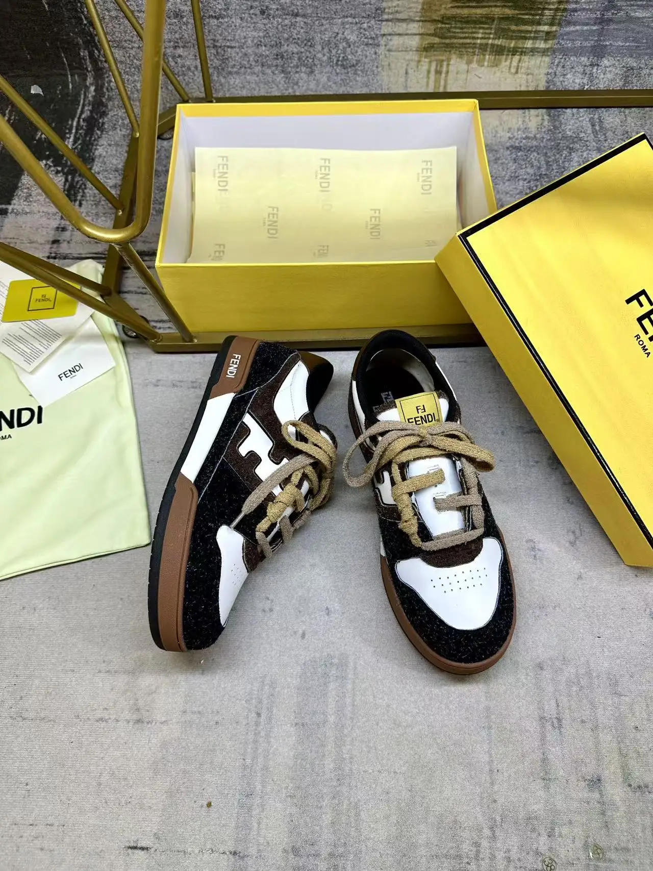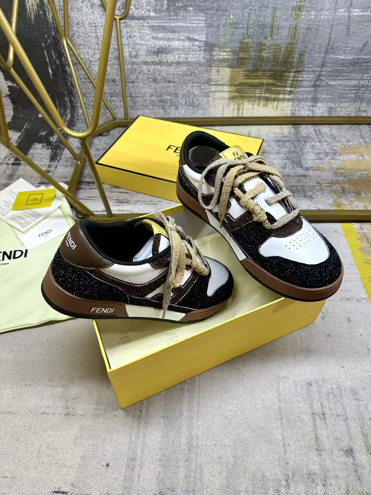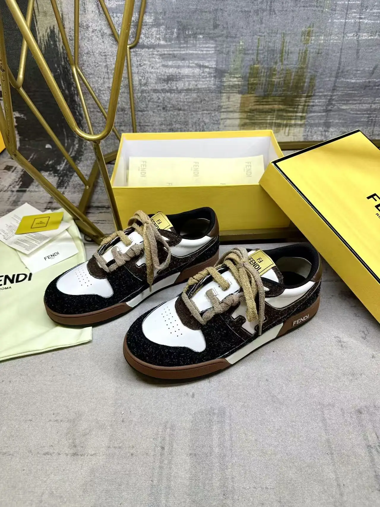 FENDI Match一脚蹬运动鞋 白色牛皮革材质 侧面采用炭灰色和深棕色长毛剖层皮革细节呈现FF图案 饰有棕色毛圈鞋带 编织成FF图案 内部松紧带设计方便穿脱 带棕色减震材质的橡胶包覆鞋底 女35-40码 男38-45码