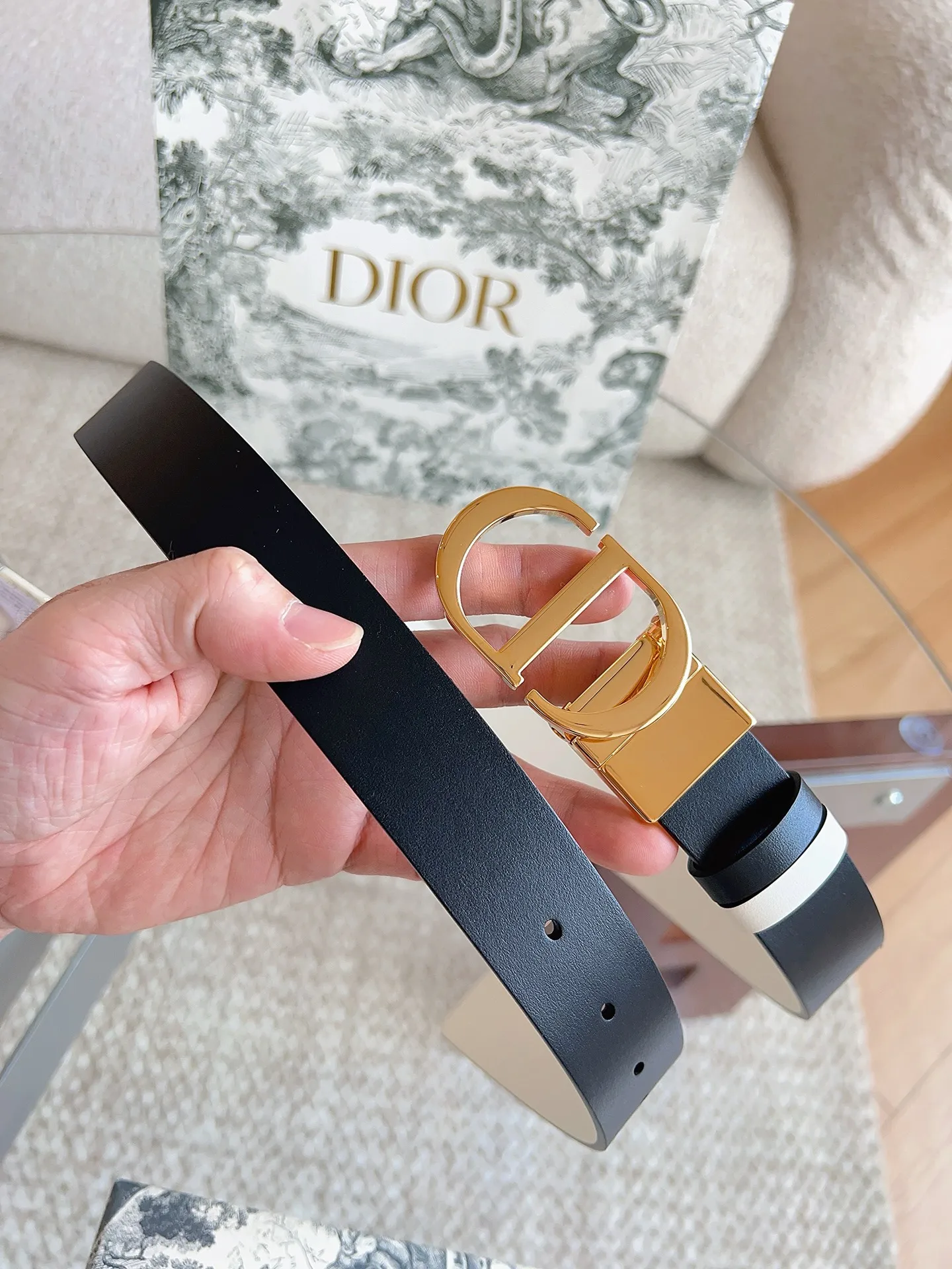 迪奥 DIOR 这款 30 Montaigne 腰带从同名手袋汲取灵感 可翻面使用 以双面设计重新诠释经典 采用光滑小牛皮革精心制作 一面为黑色 另一面为奶白色 搭配富有光泽的饰面金属 CD 腰带扣 搭配两个可拆卸的腰带环 可选择与同色调或对比鲜明的时尚风格搭配