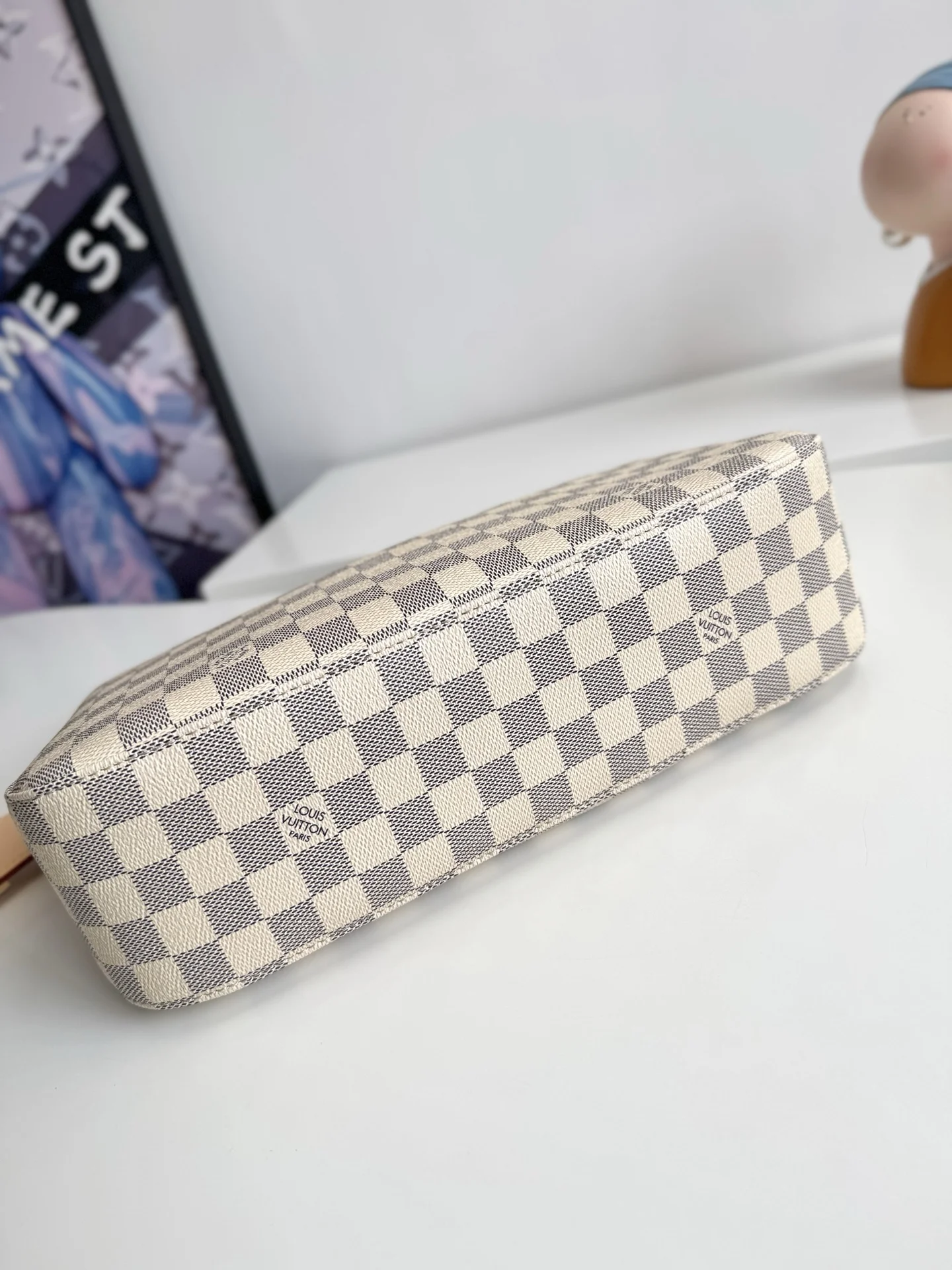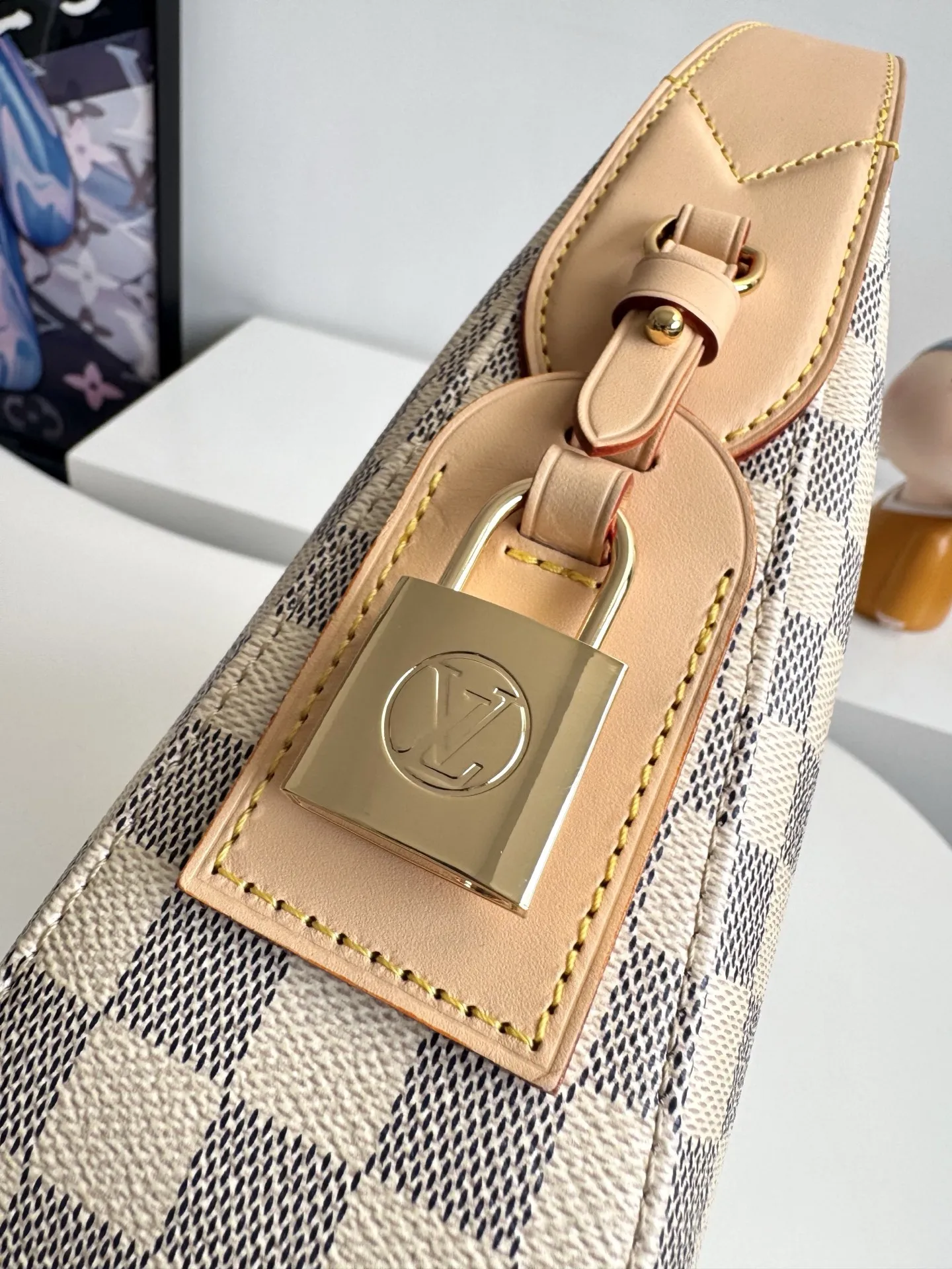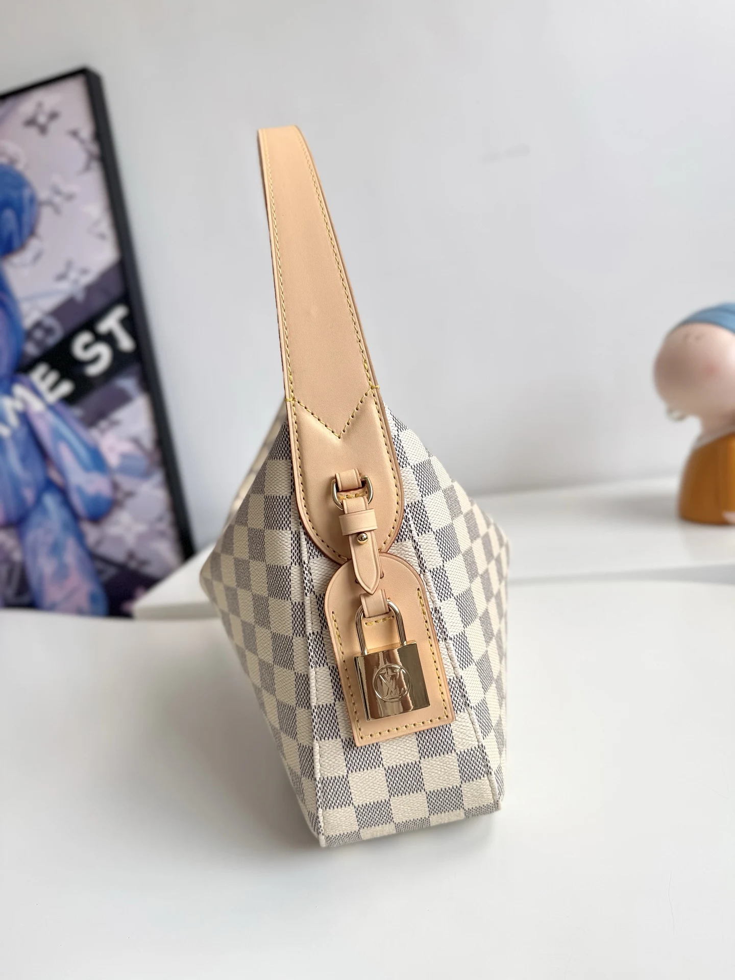 海外原单N00116独家实拍 作为Damier Azur系列的一部分 这款Slouchy PM版受到法国里维埃拉优雅生活方式的启发 独特的图案采用日光凹版印刷工艺制作 并配以光滑的金色硬件 标志性细节包括天然皮革姓名牌 其中包含象征品牌传承和工艺的挂锁 尺寸 33×22×9cm