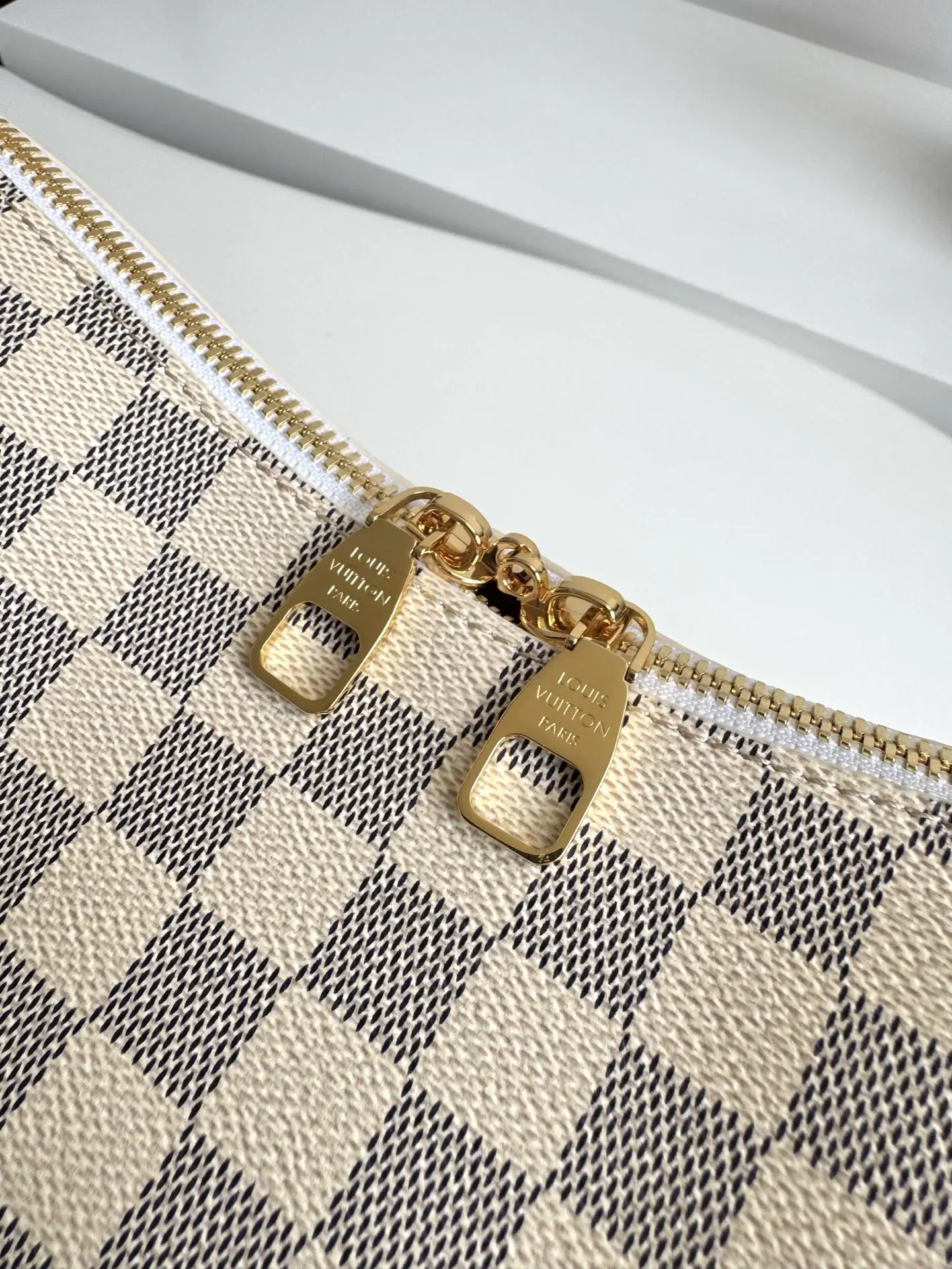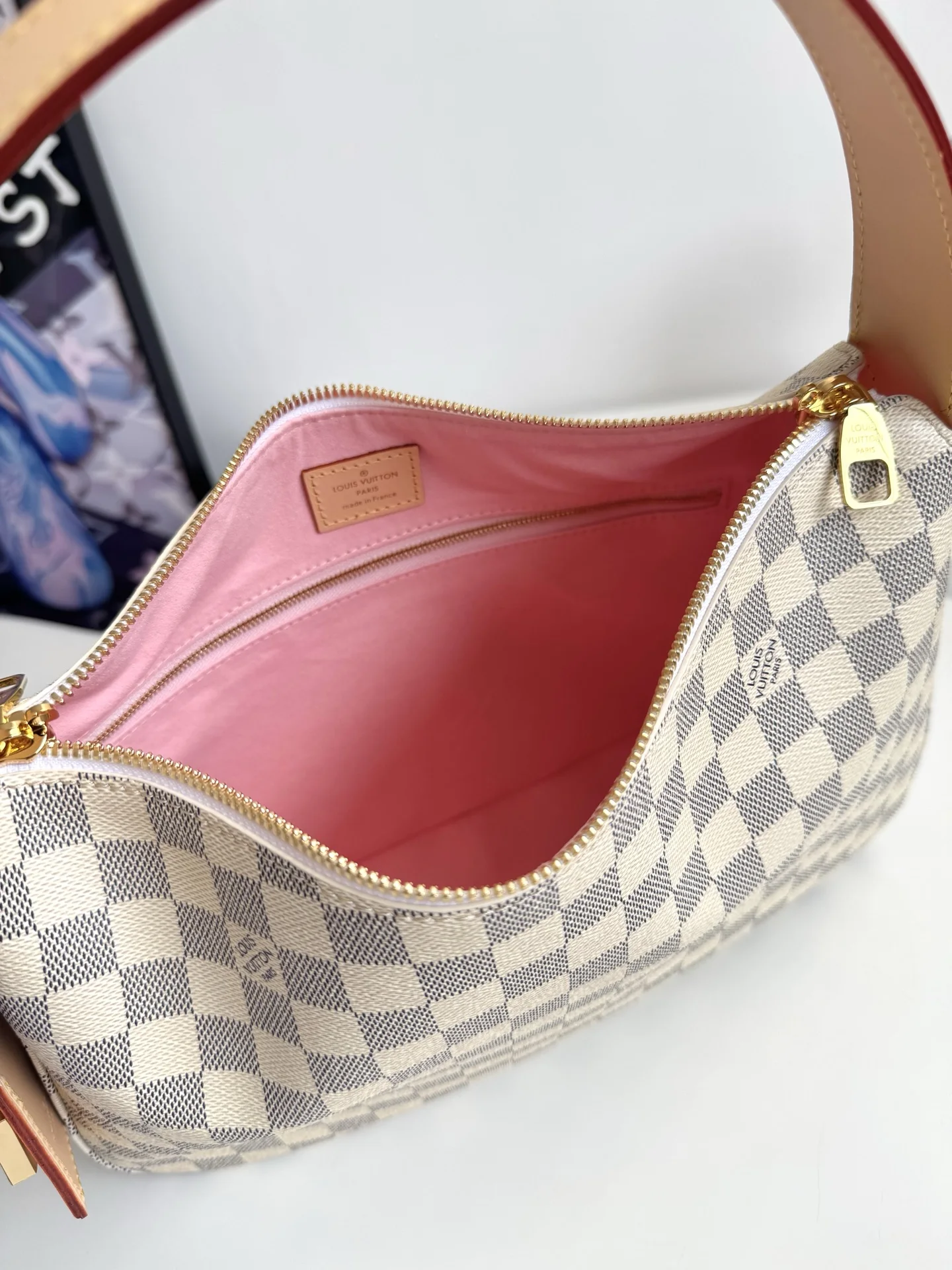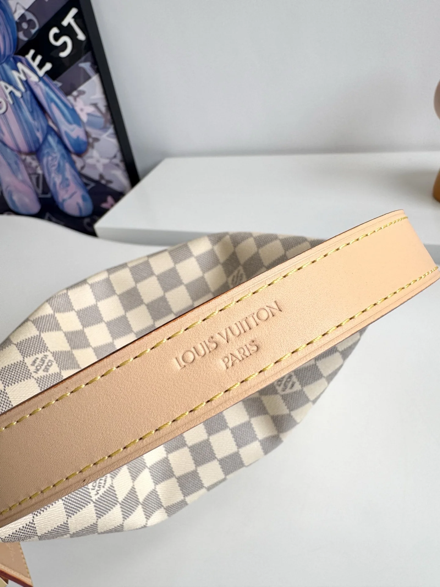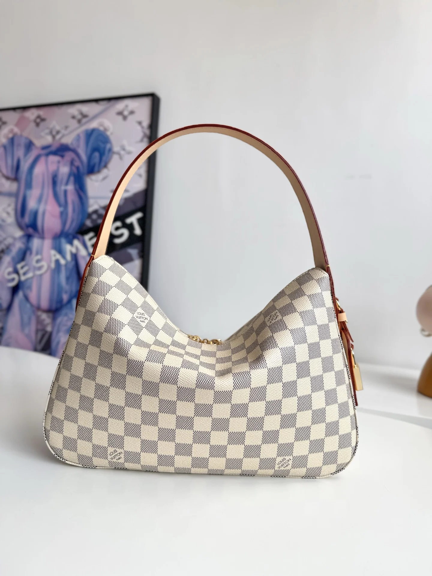 海外原单N00116独家实拍 作为Damier Azur系列的一部分 这款Slouchy PM版受到法国里维埃拉优雅生活方式的启发 独特的图案采用日光凹版印刷工艺制作 并配以光滑的金色硬件 标志性细节包括天然皮革姓名牌 其中包含象征品牌传承和工艺的挂锁 尺寸 33×22×9cm