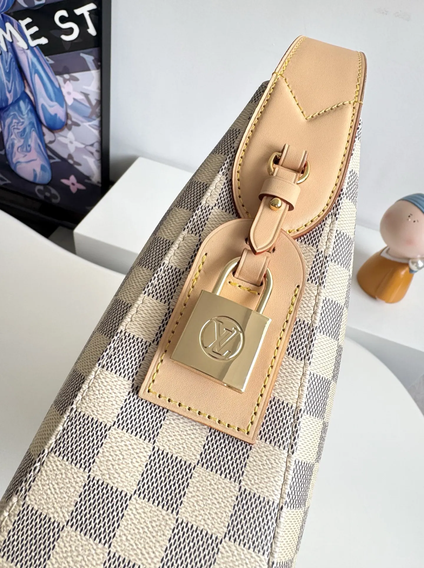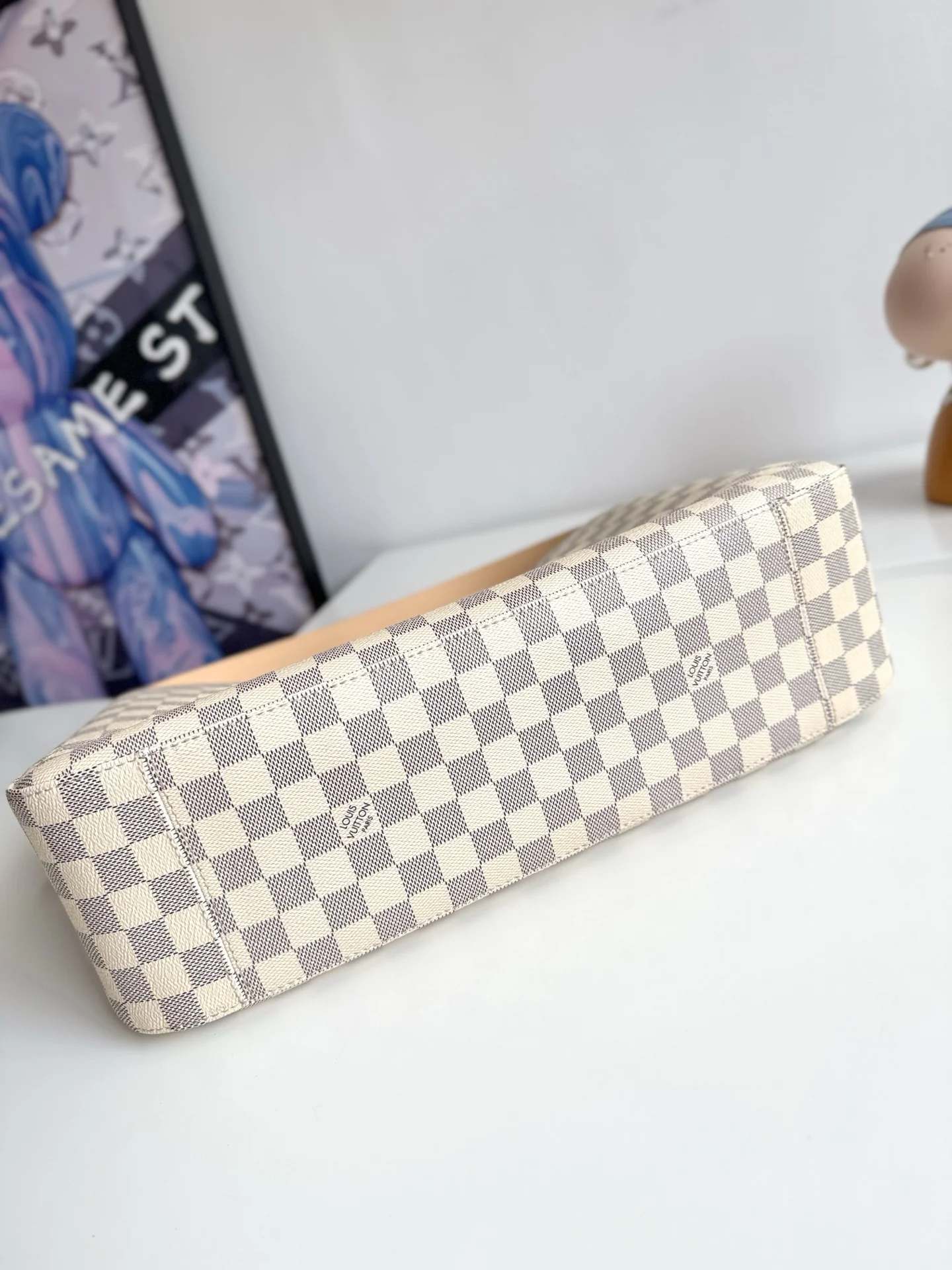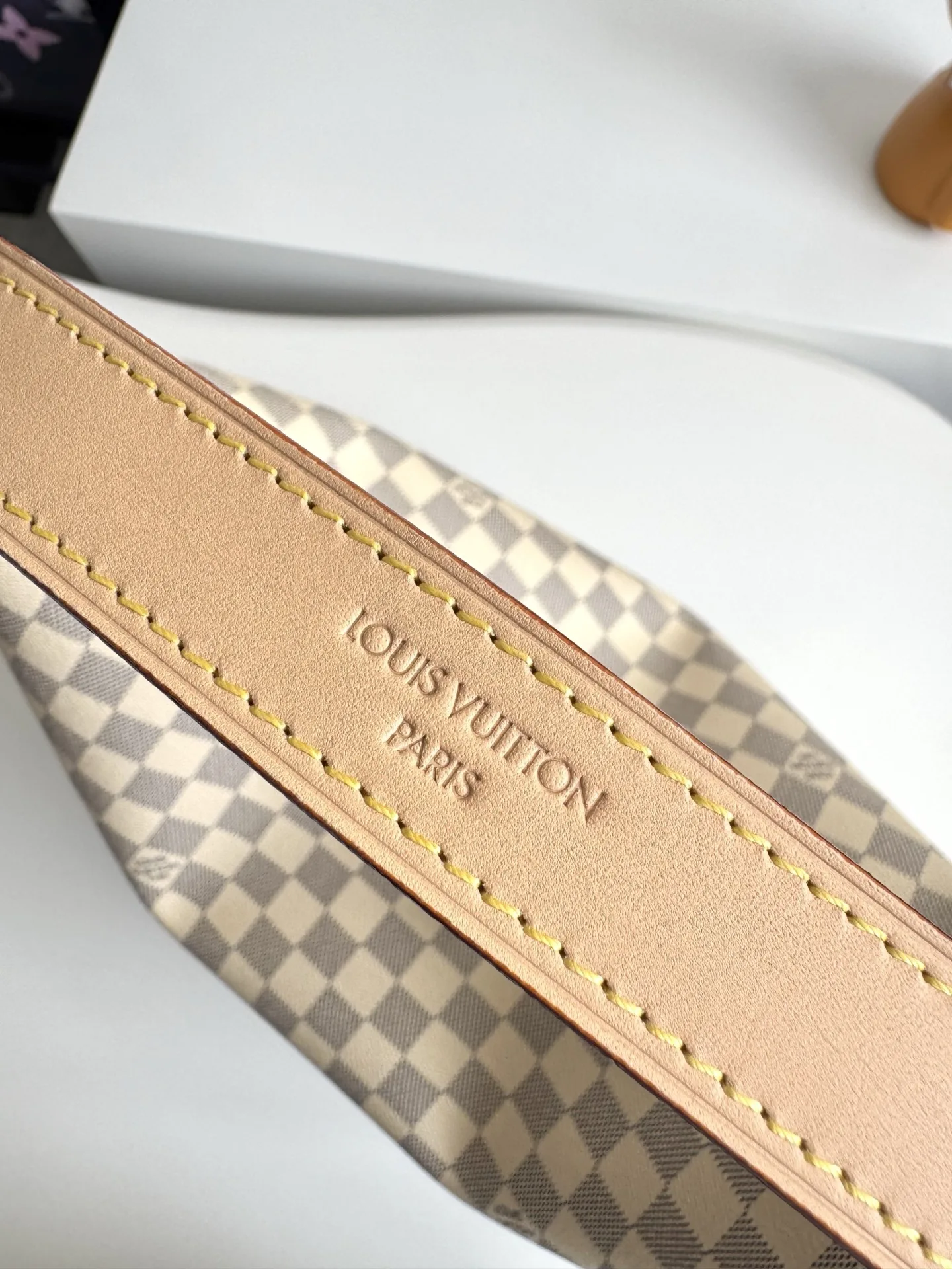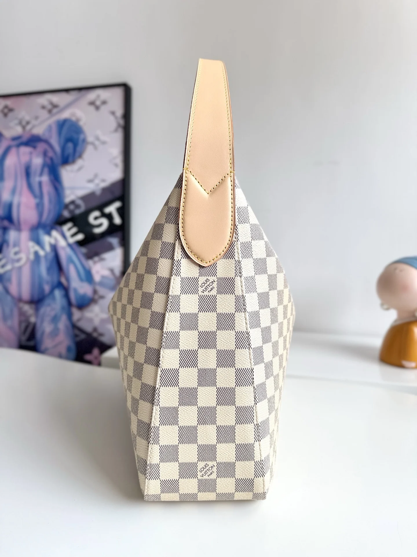 海外原单N00126独家实拍 这款提升版的Slouchy MM 展示了该品牌的Damier Azur图案作为整个图形的签名 功能性和精致性兼备 它由涂布帆布制成 采用日光凹版印刷技术创造独特的图案 它配有签名挂锁名称标签 内部有足够的空间存放从工作到周末必备的物品 尺寸 40×31×11cm