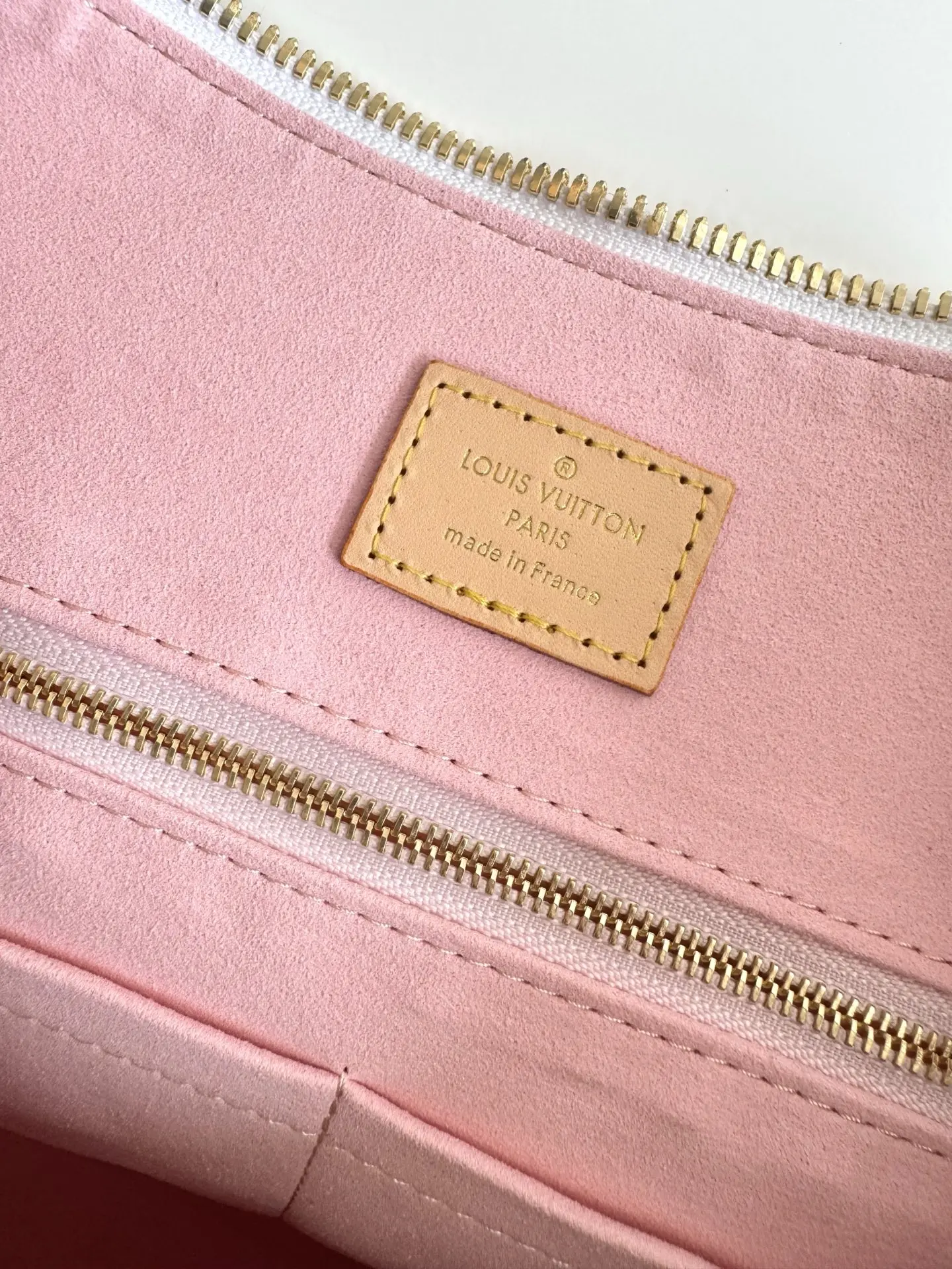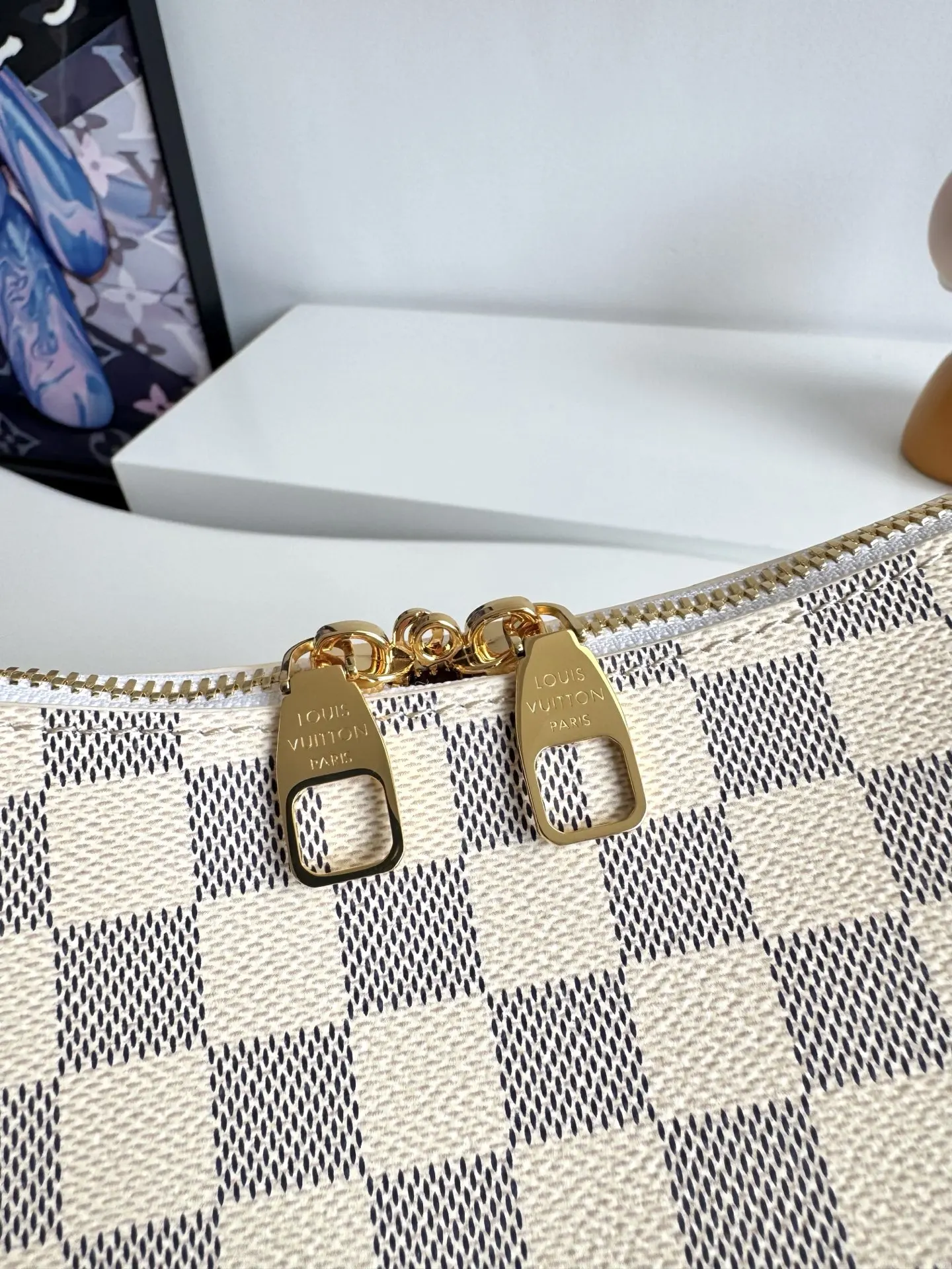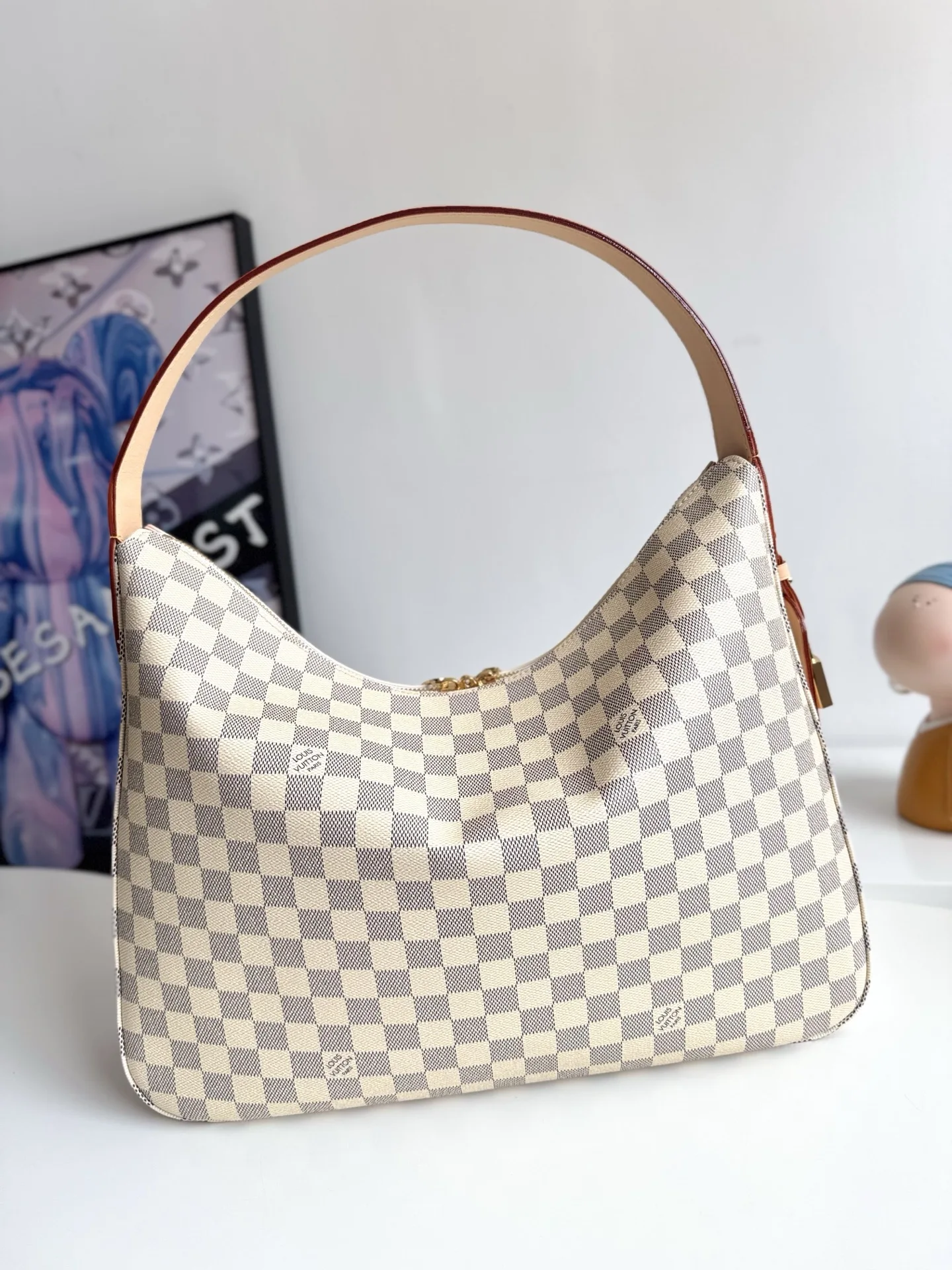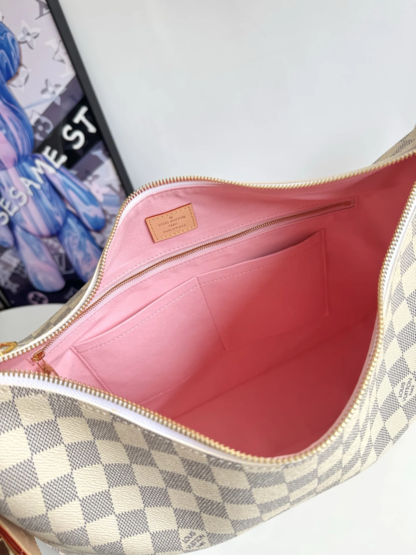 海外原单N00126独家实拍 这款提升版的Slouchy MM 展示了该品牌的Damier Azur图案作为整个图形的签名 功能性和精致性兼备 它由涂布帆布制成 采用日光凹版印刷技术创造独特的图案 它配有签名挂锁名称标签 内部有足够的空间存放从工作到周末必备的物品 尺寸 40×31×11cm