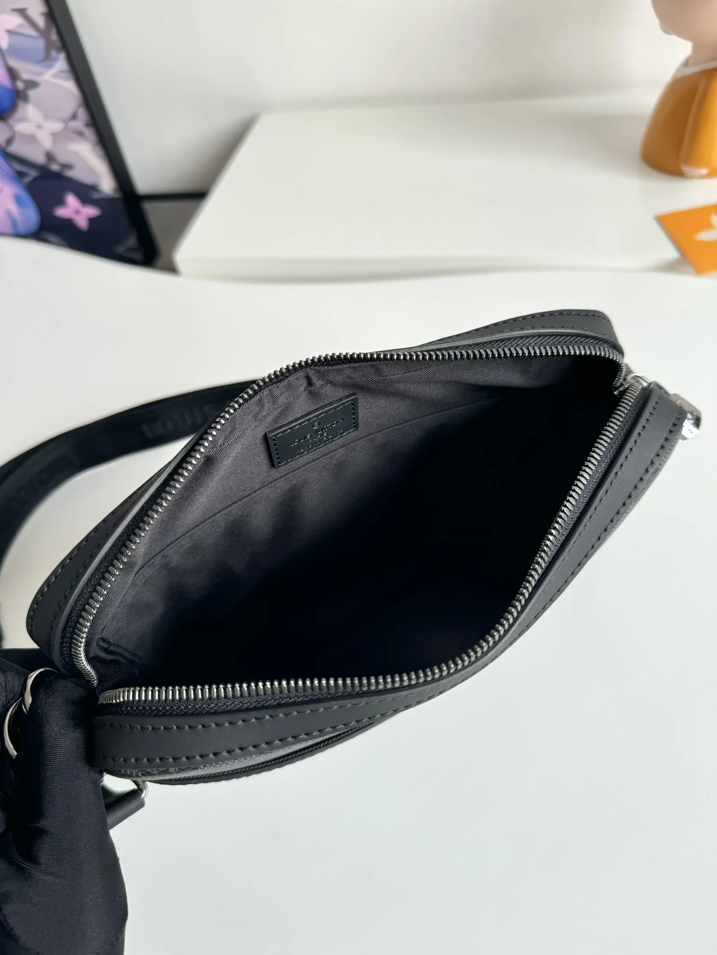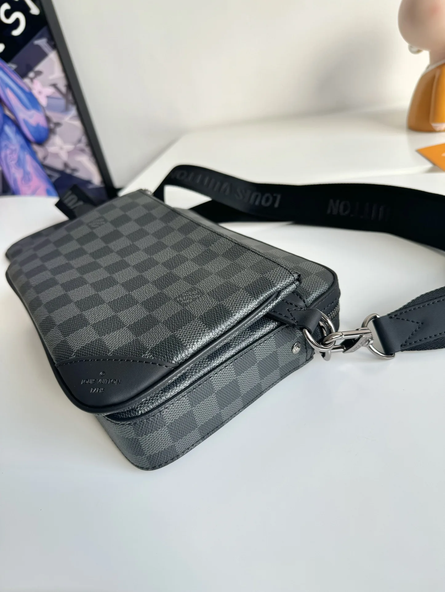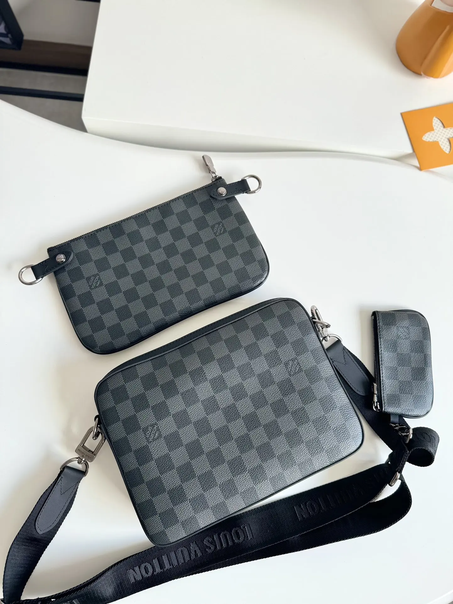 海外原单N40519独家实拍 本款 Trio 邮差包以 Damier Graphite 帆布重绎经典设计 拥有主袋 可拆卸拉链袋和固定于肩带的零包 后者轻松实现免触支付 尺寸 25×18.5×7cm