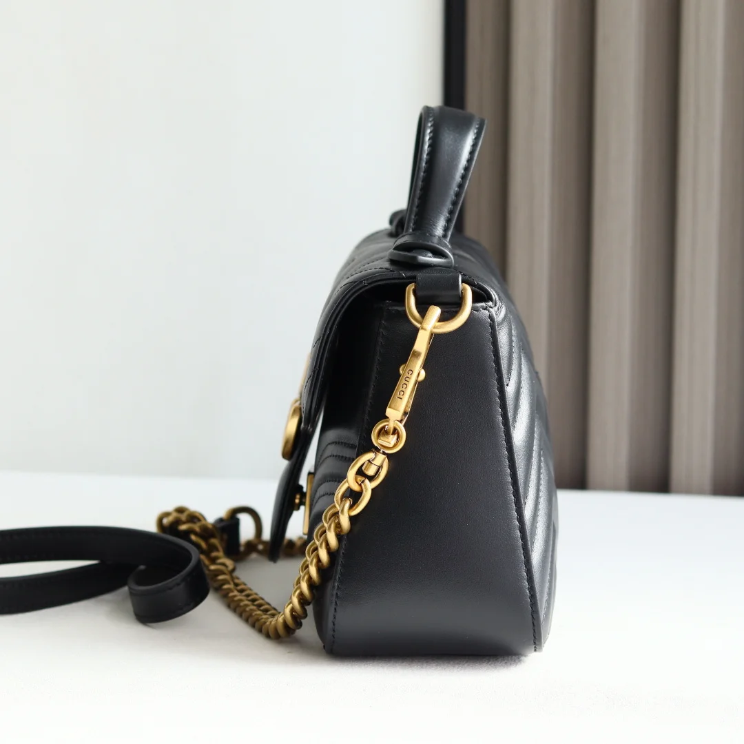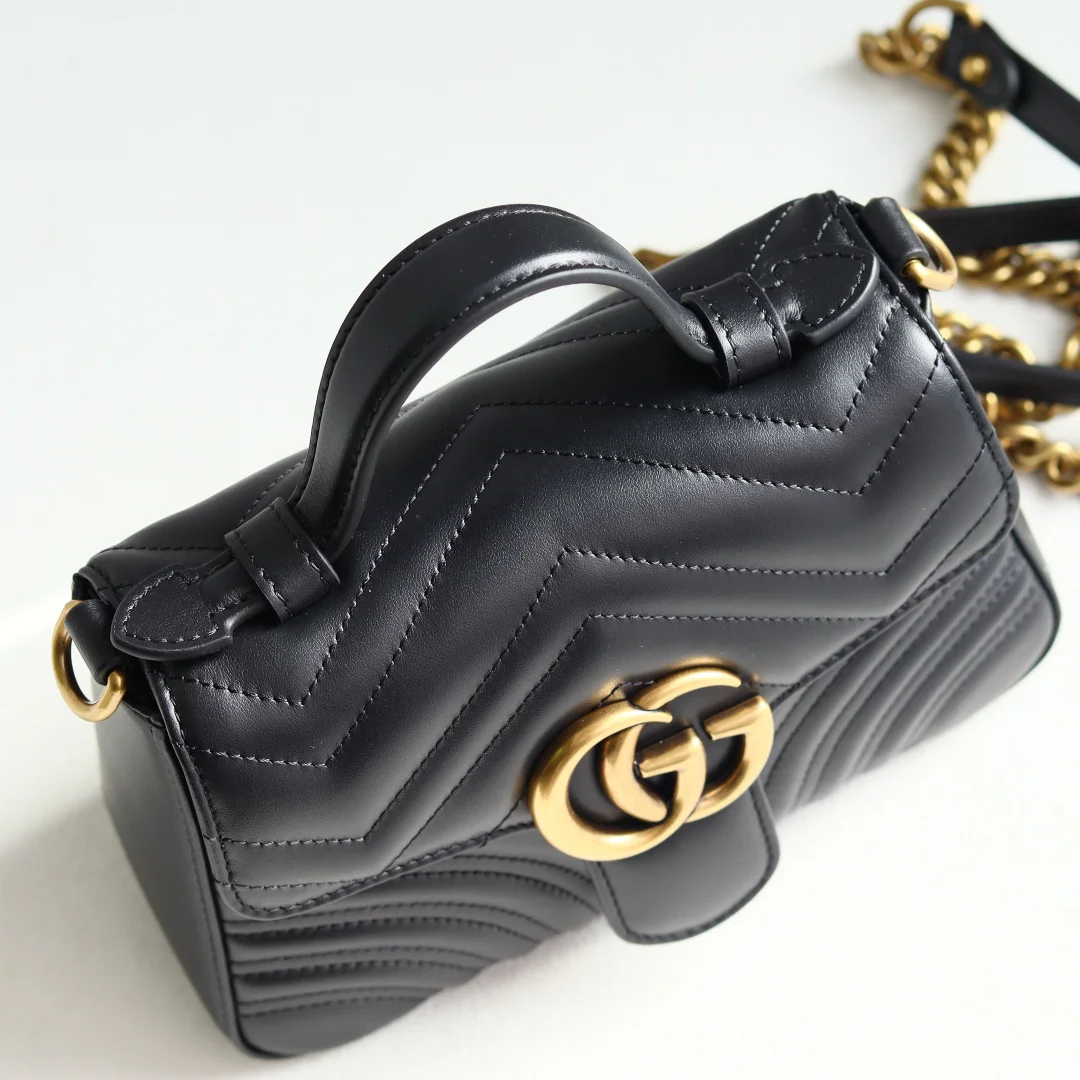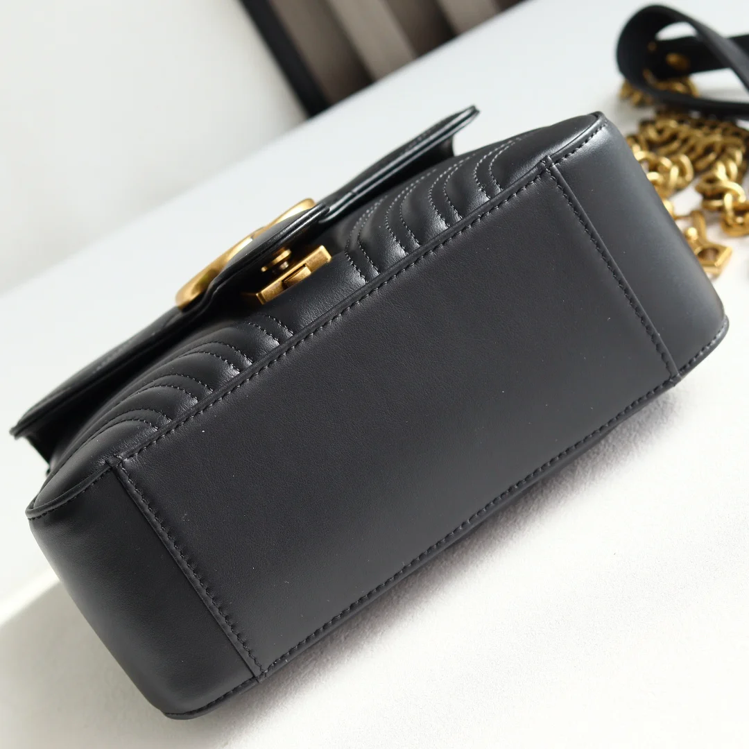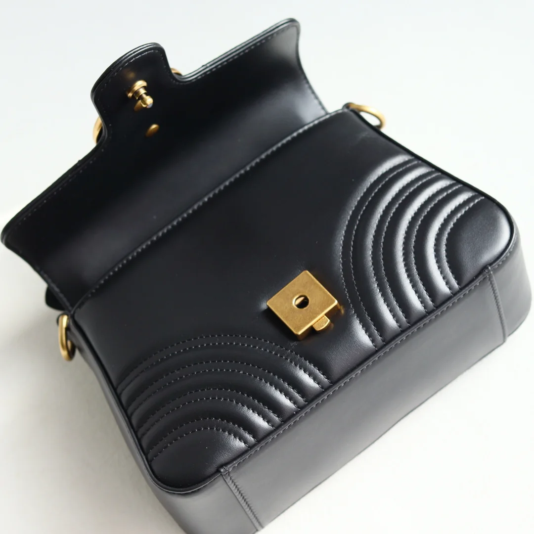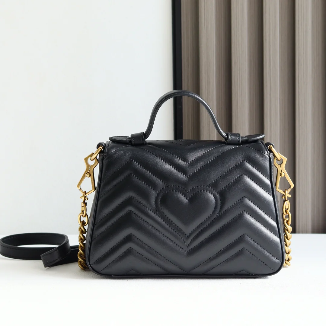 原厂皮)全新升级版GG Marmont邮差包系列型号 尺寸 21*15*8cm GG Marmont 它的流行一直从未停止过 没有比它更好看的邮差包了 双G衔缝迷你手提单肩斜挎链条包 经典双G标志 背面爱心设计 让整个包添了一些少女的可爱气息 手提设计 让你拥有不同的背法