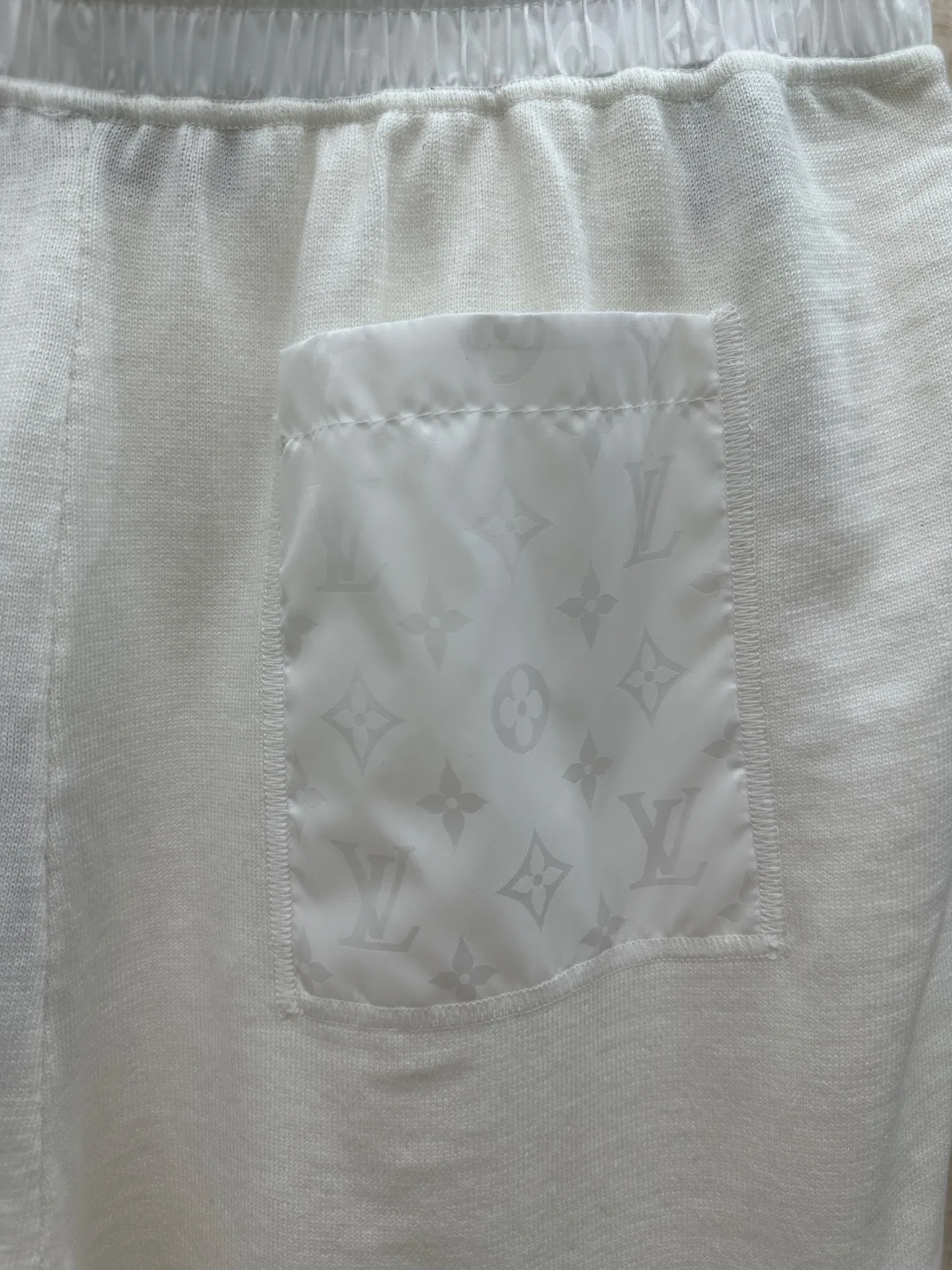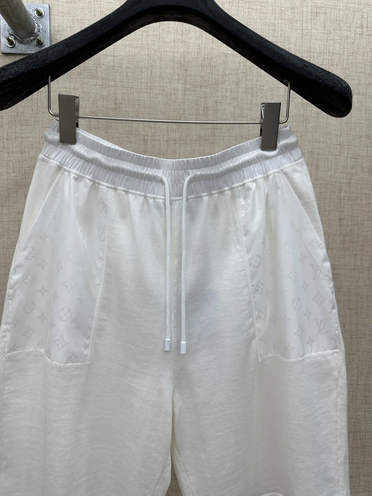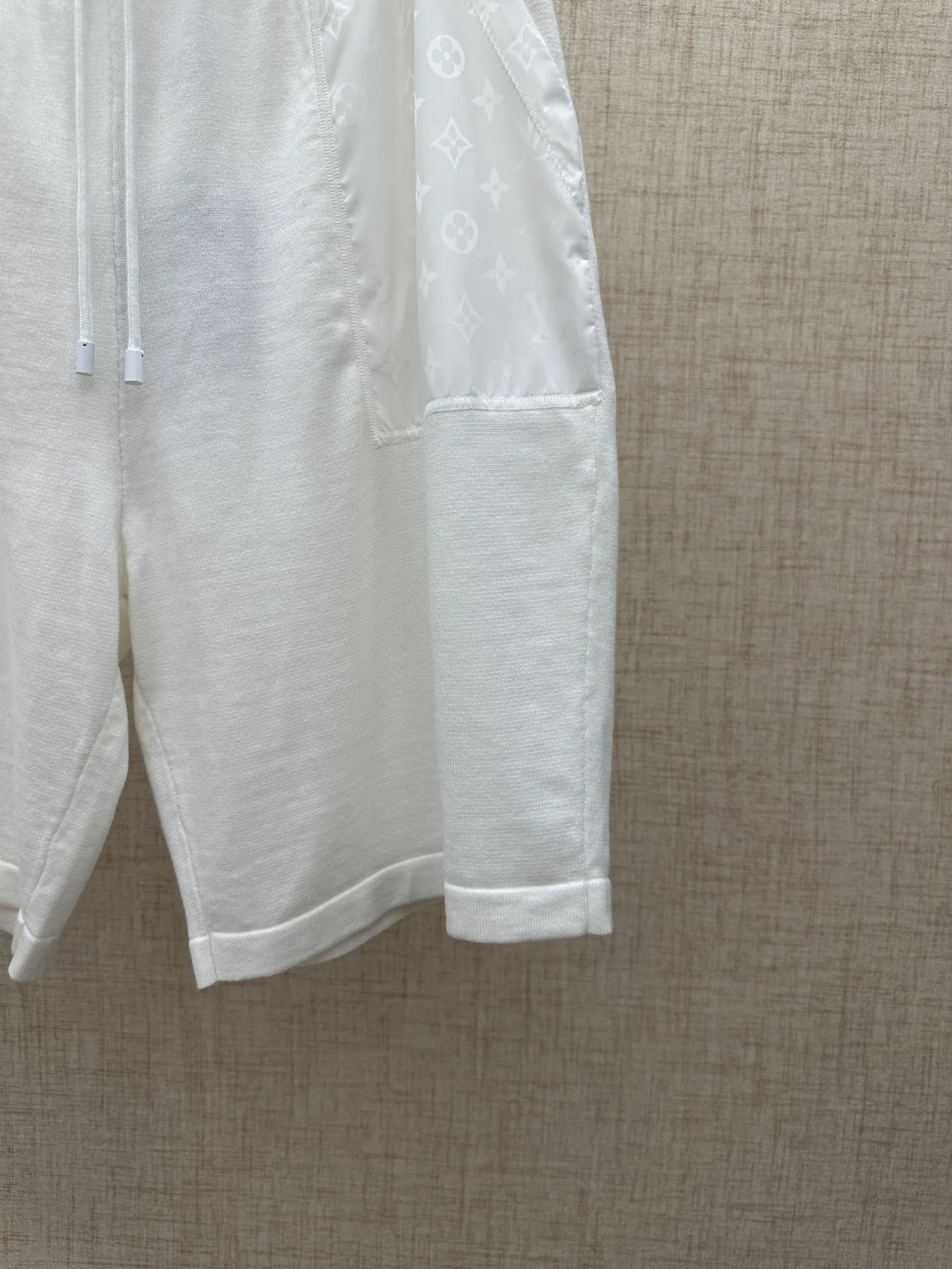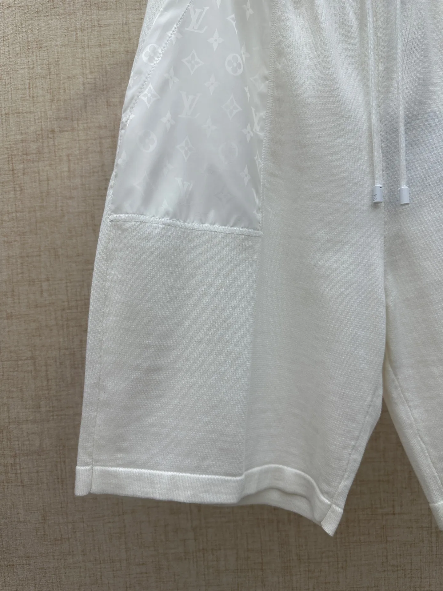 LV MONOGRAM 锦纶嵌饰短裤材质拼接主体为亲肤棉质针织 两侧口袋及后袋采用带有同色Monogram暗纹的锦纶面料拼接 在白色基底上呈现品牌标识