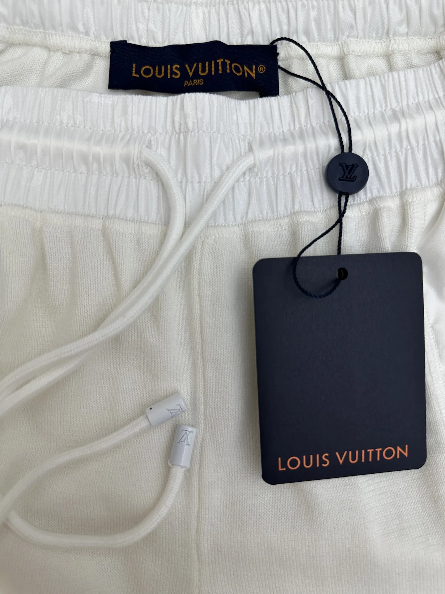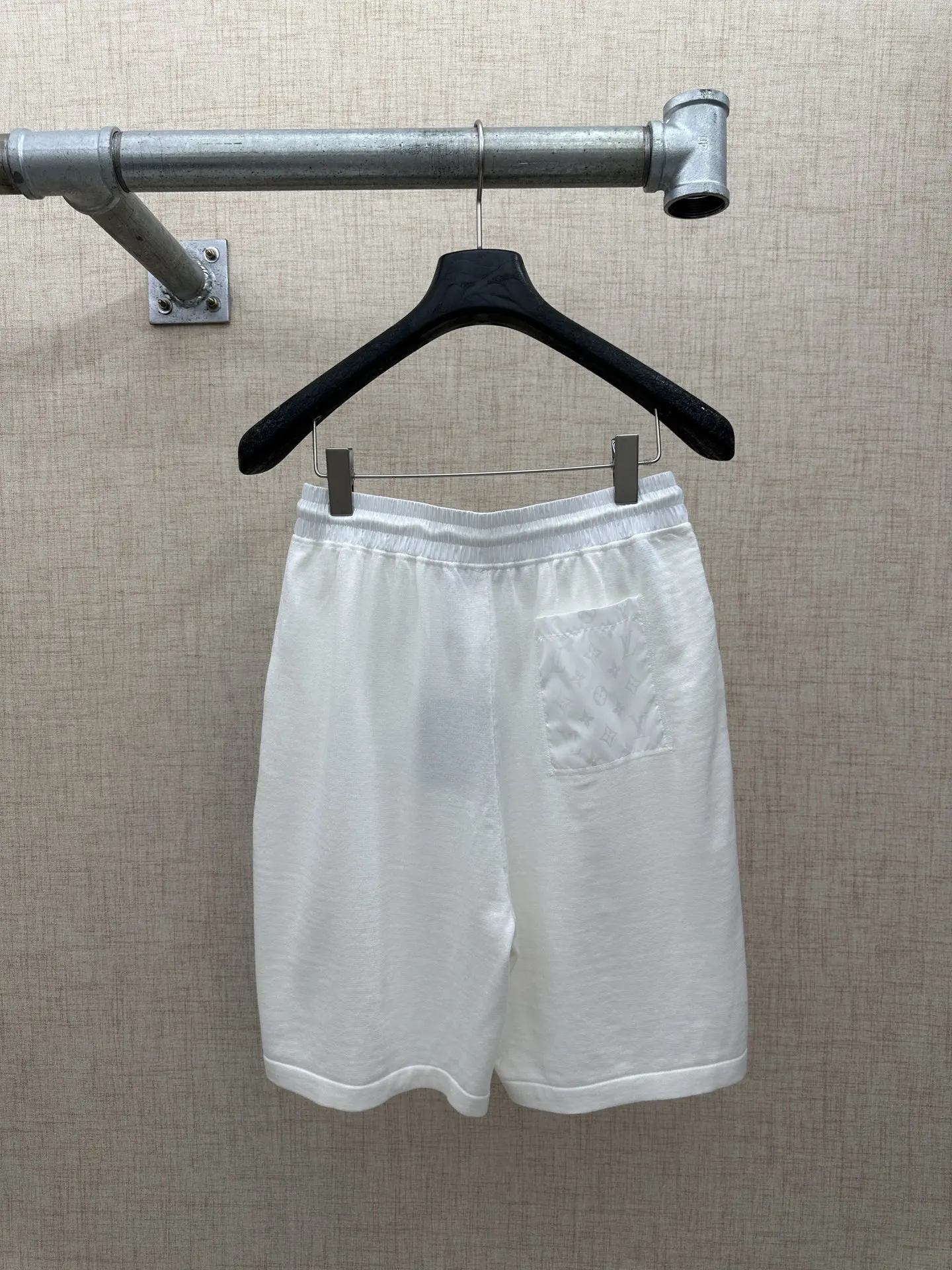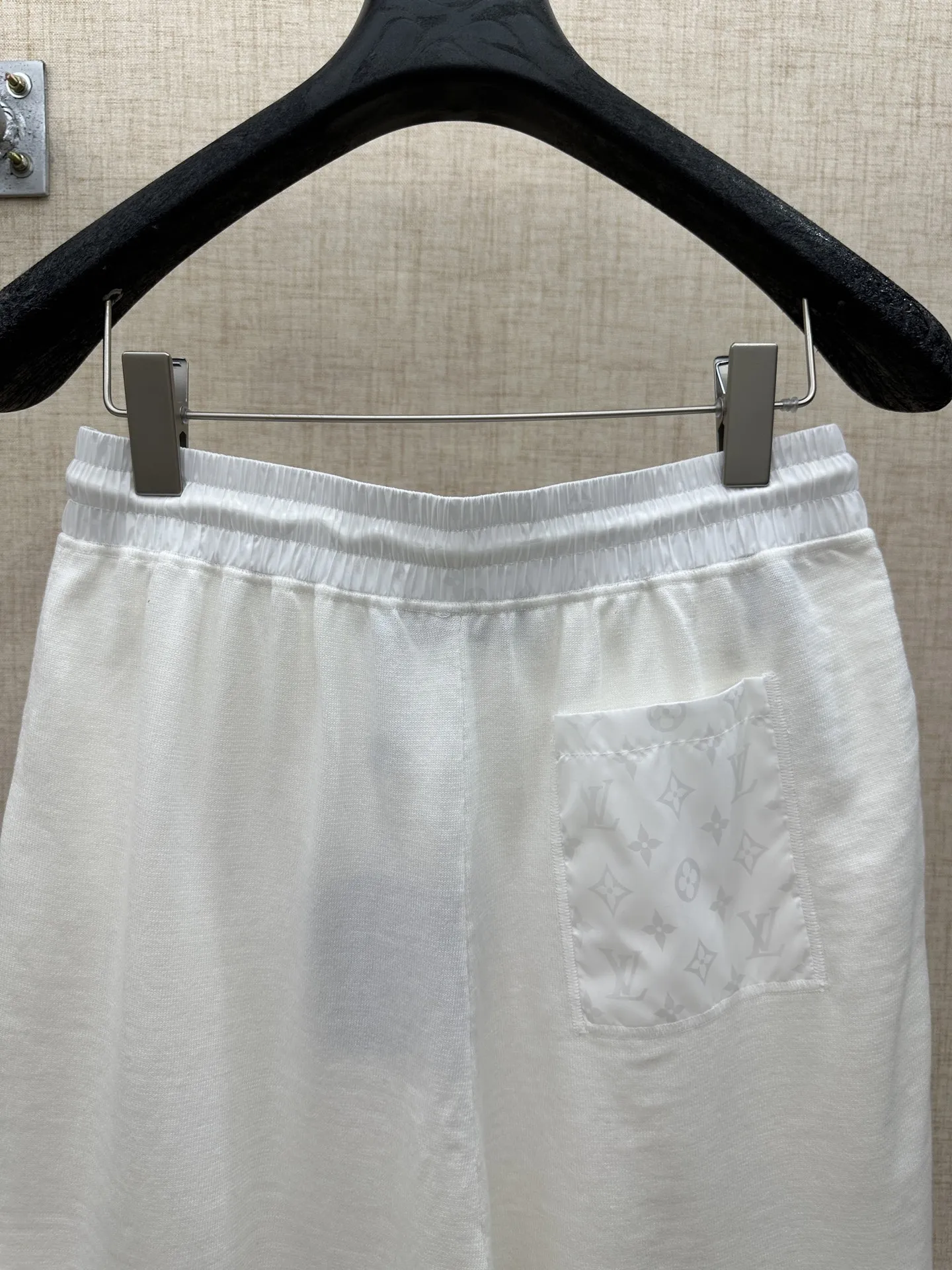 LV MONOGRAM 锦纶嵌饰短裤材质拼接主体为亲肤棉质针织 两侧口袋及后袋采用带有同色Monogram暗纹的锦纶面料拼接 在白色基底上呈现品牌标识