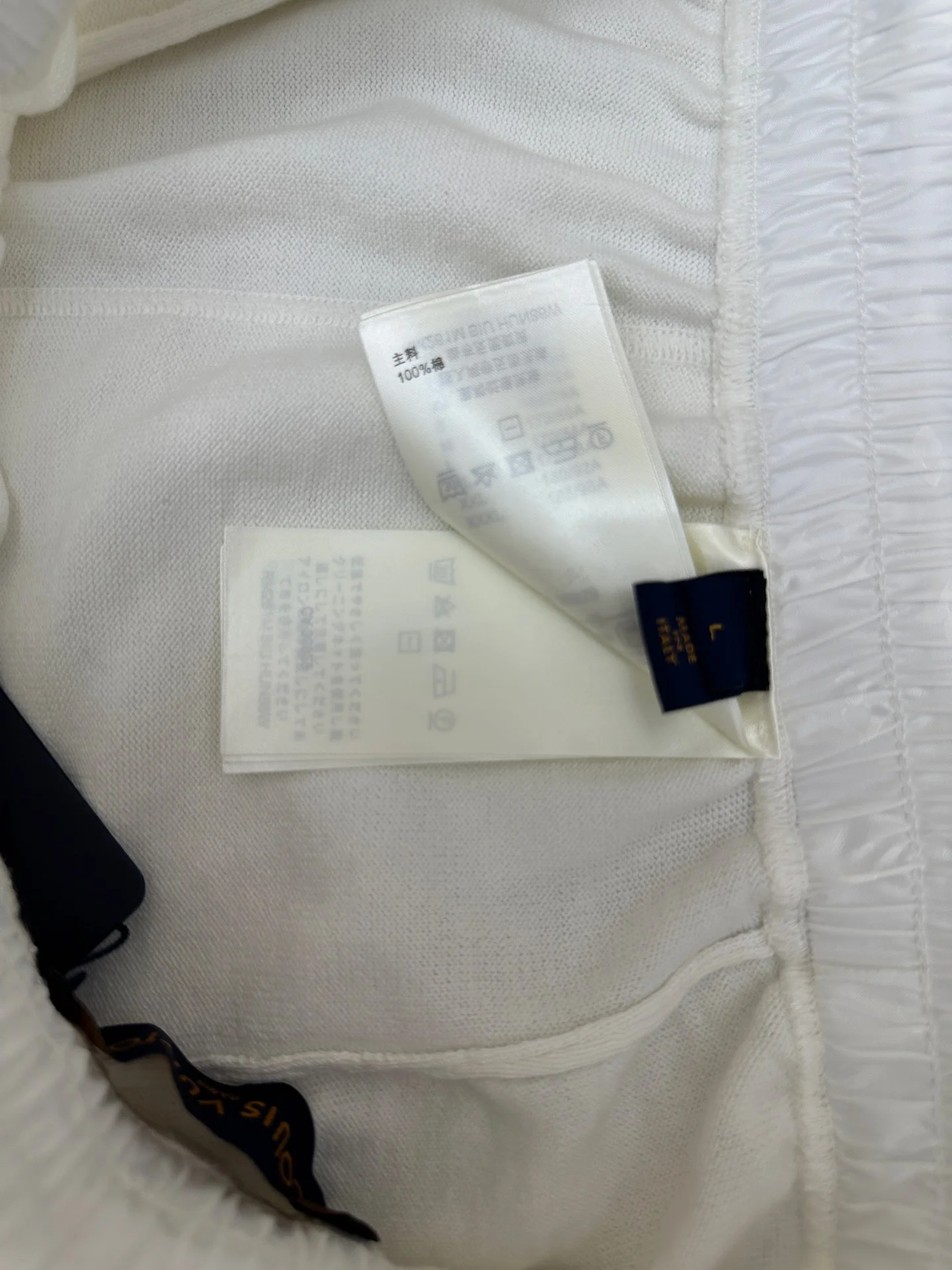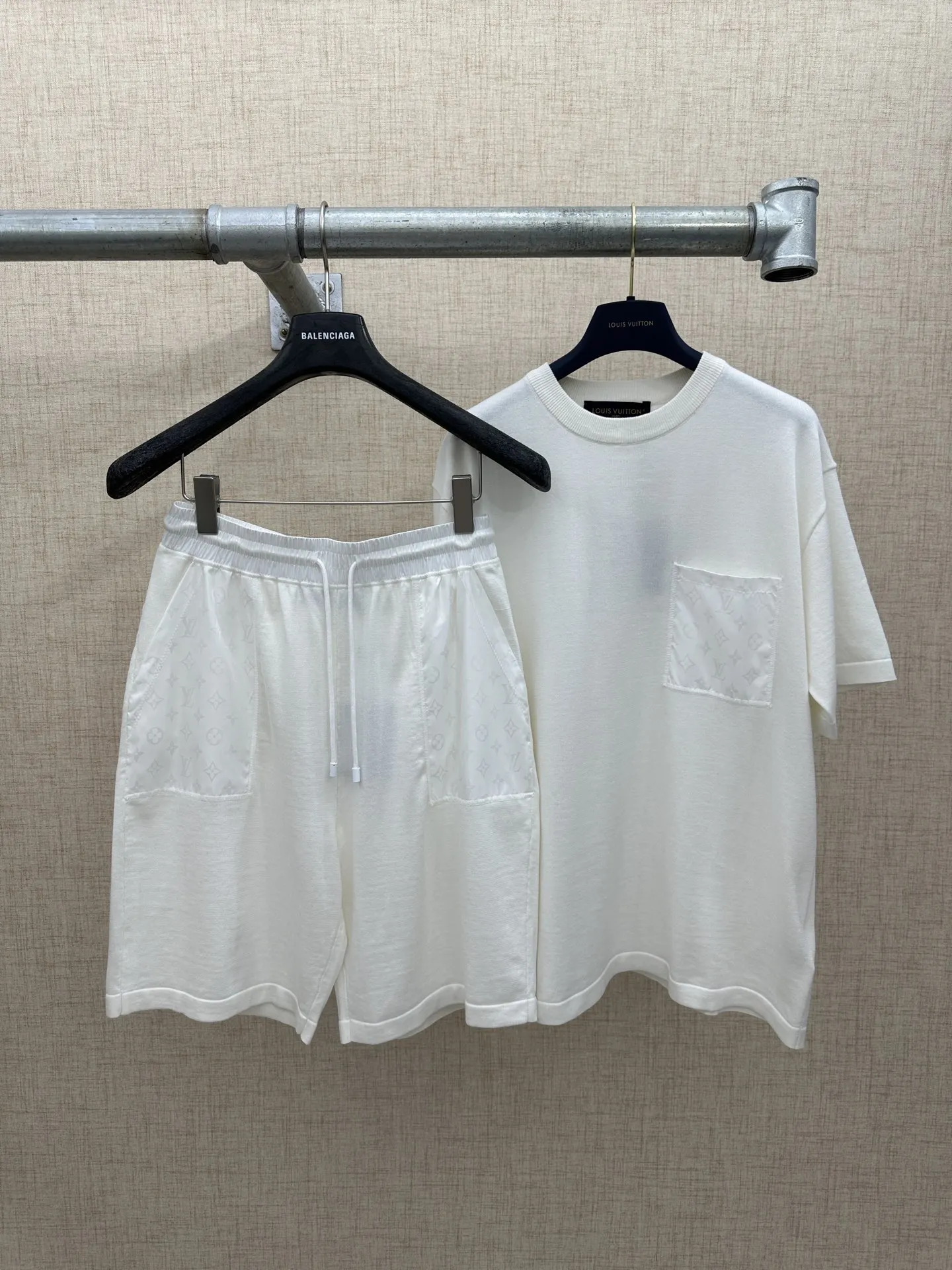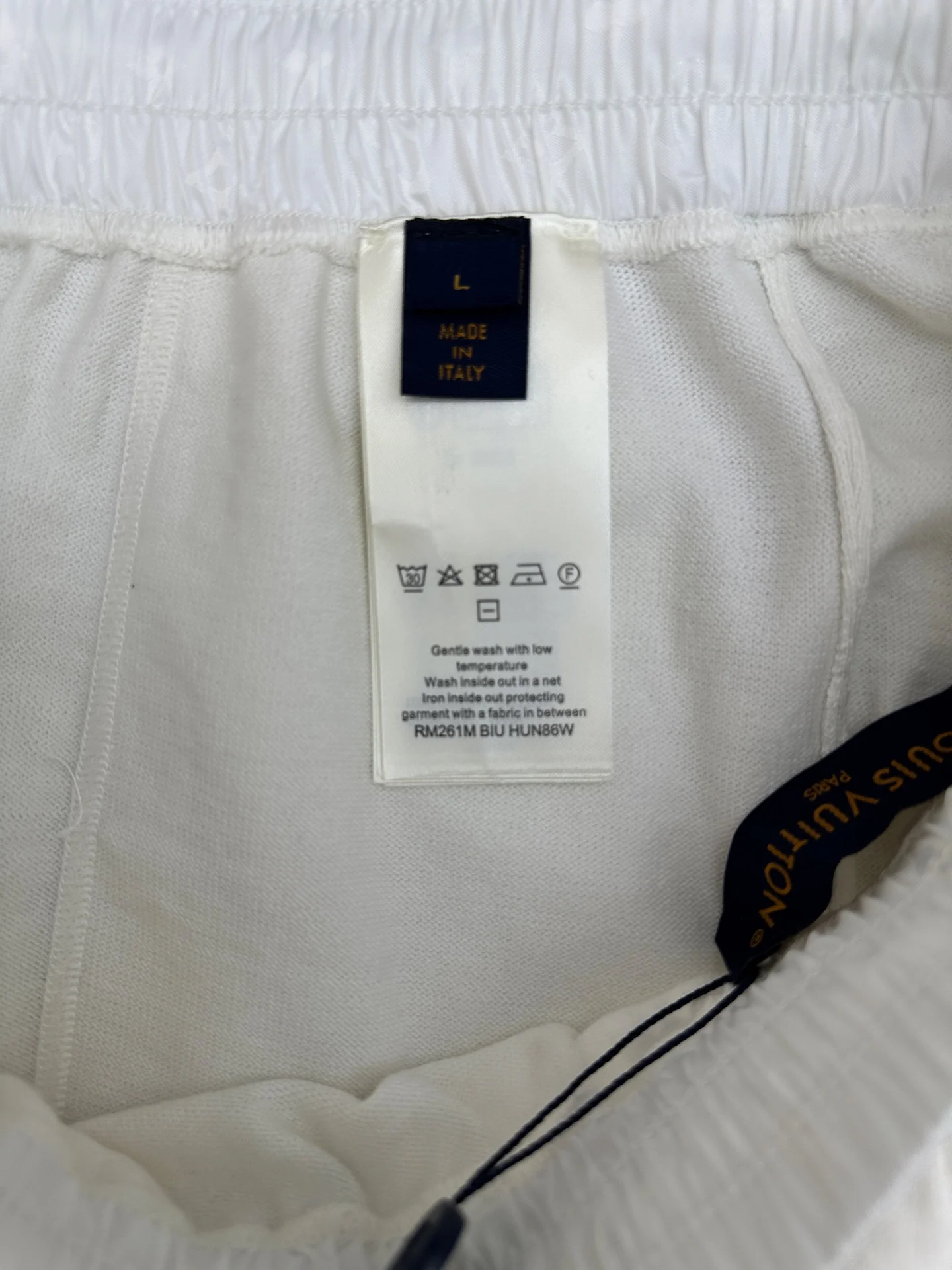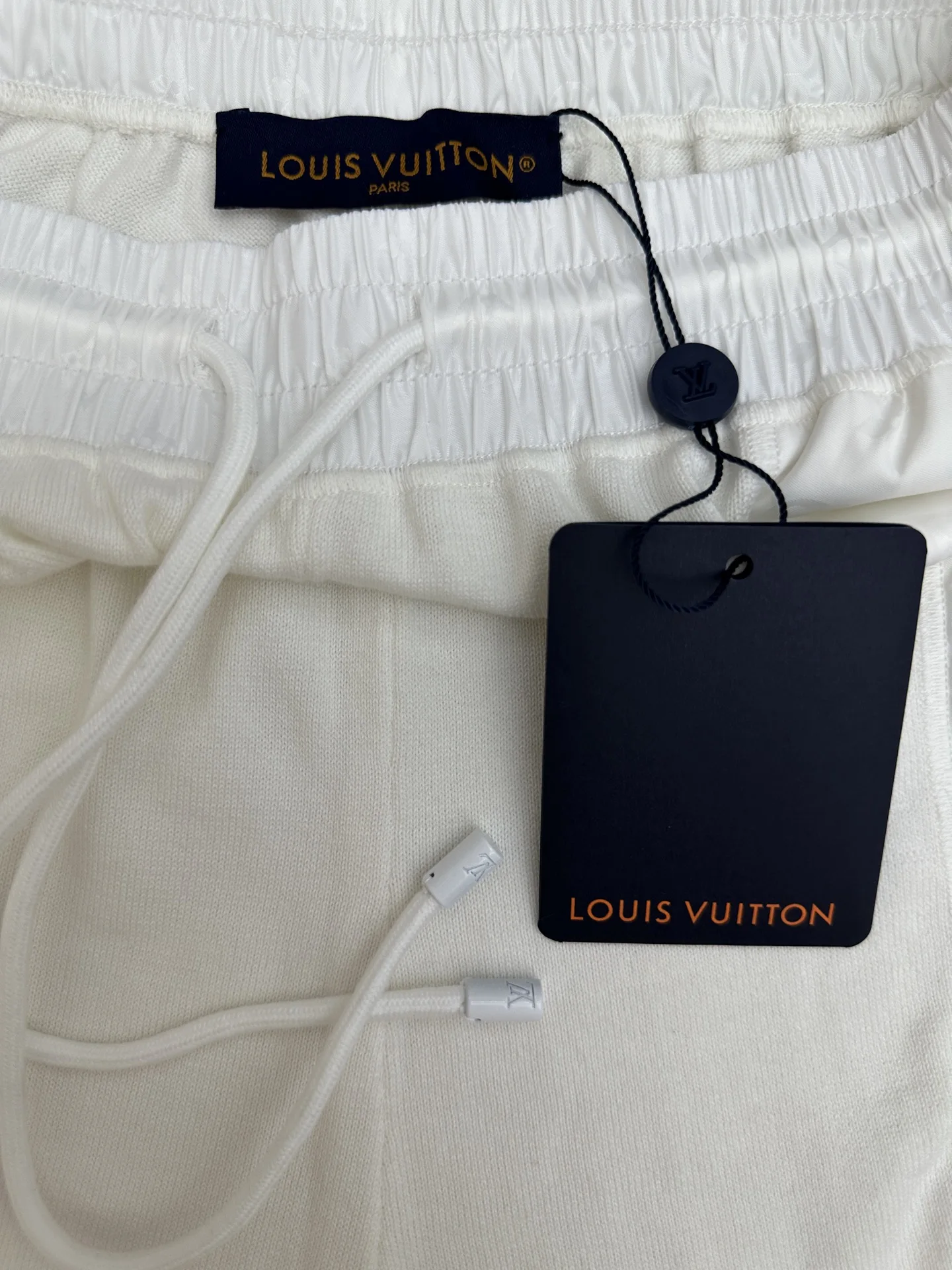 LV MONOGRAM 锦纶嵌饰短裤材质拼接主体为亲肤棉质针织 两侧口袋及后袋采用带有同色Monogram暗纹的锦纶面料拼接 在白色基底上呈现品牌标识