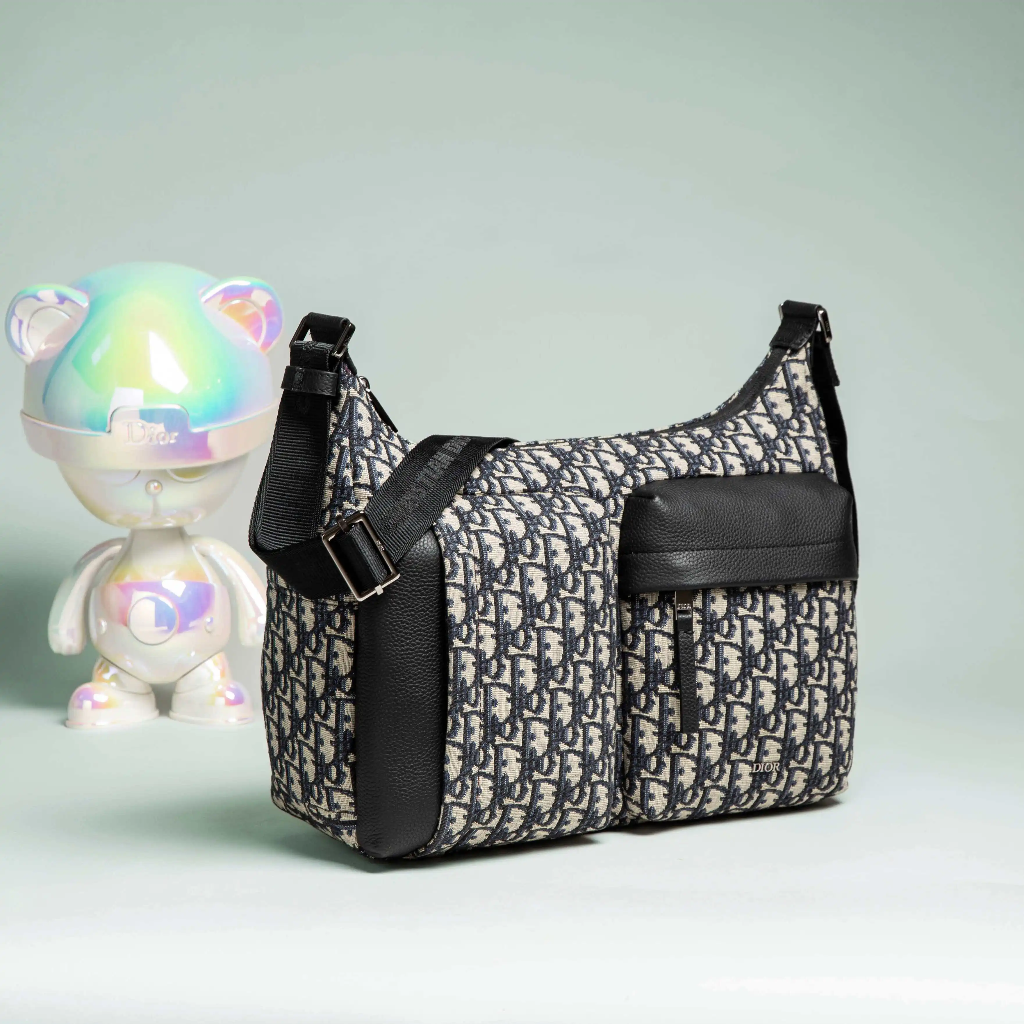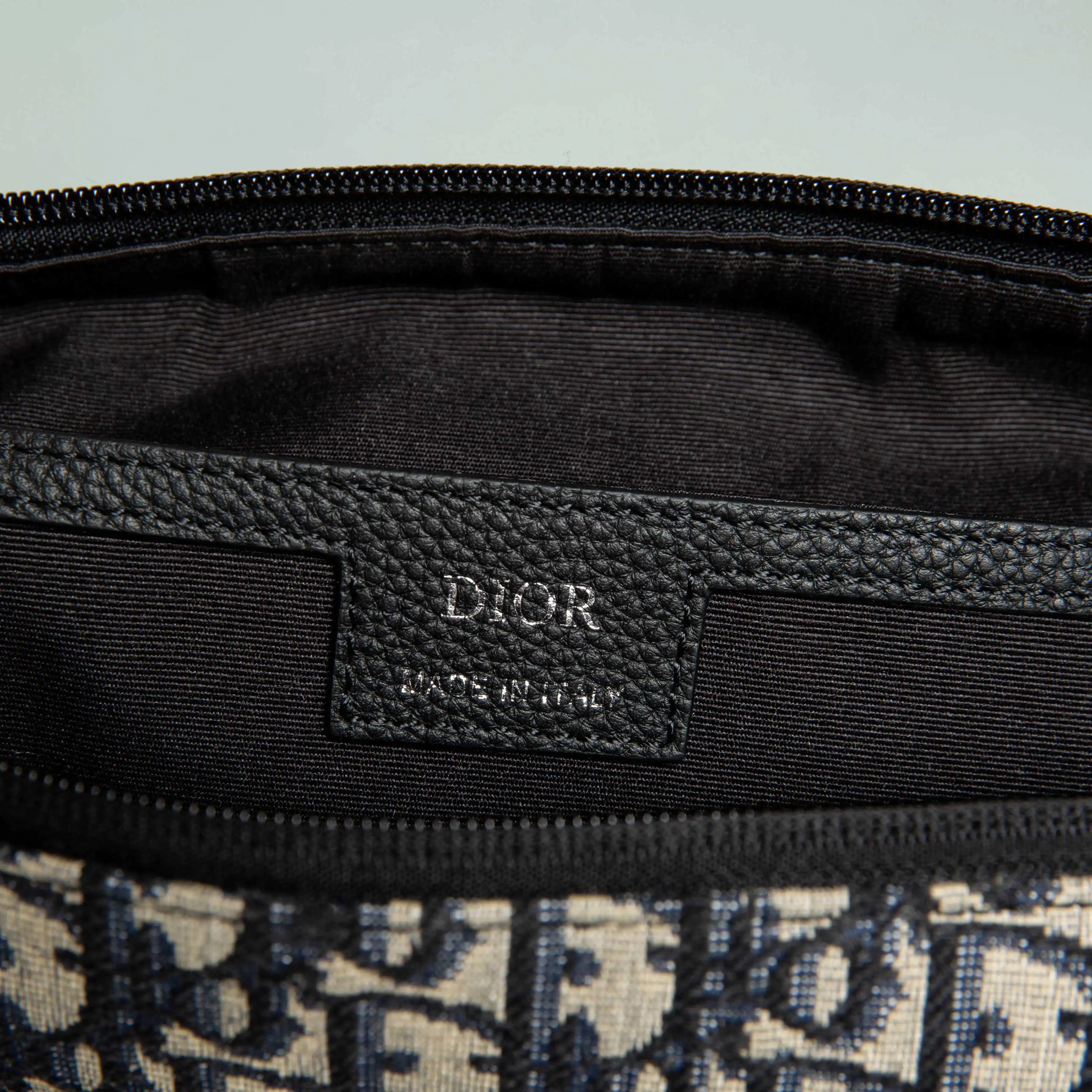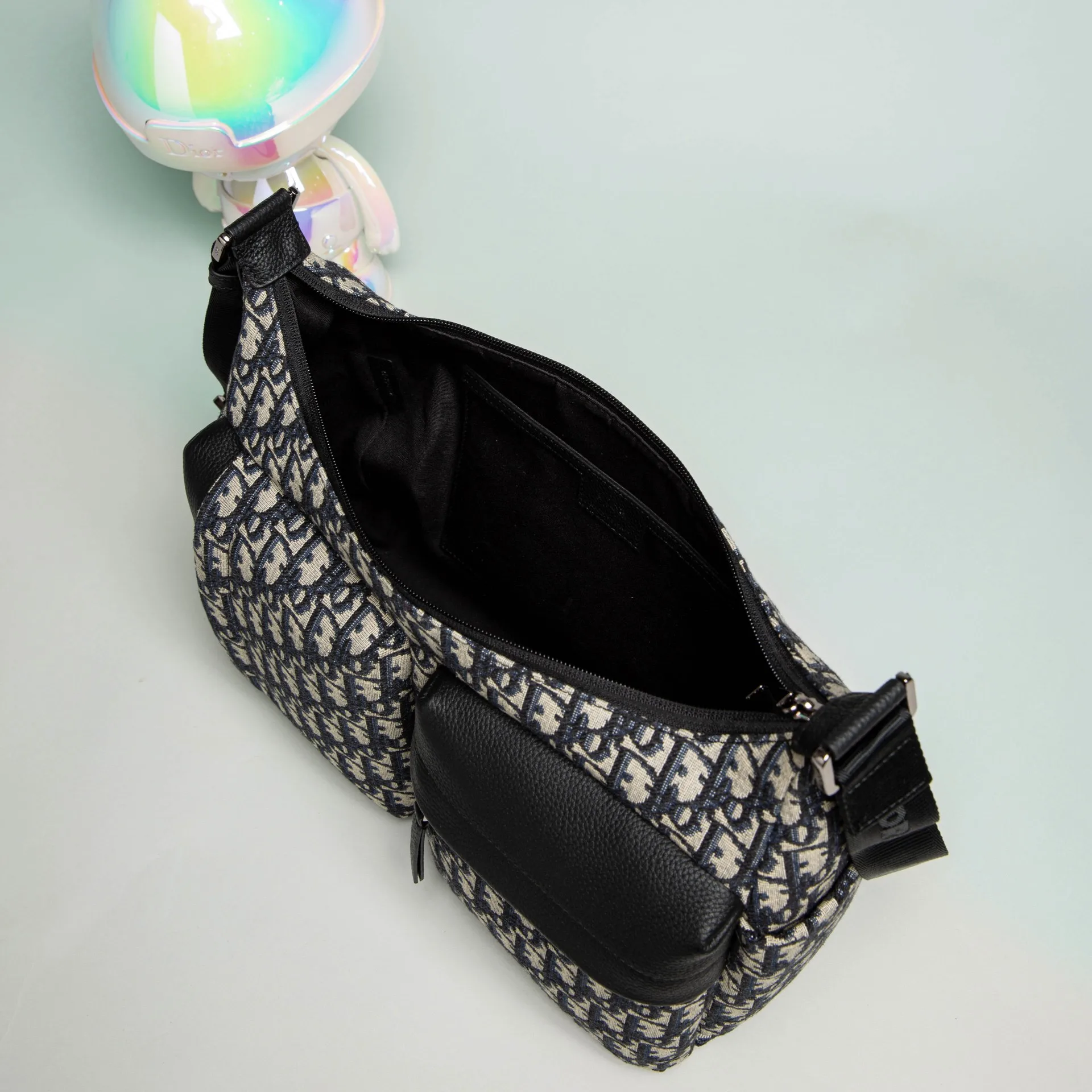 米色和黑色 Oblique 印花面料 饰以黑色粒面牛皮革细节提升格调 设有拉链隔层 两个正面拉链口袋和两个侧面插袋 可收纳各种日常用品 搭配可调节肩带 可肩背或斜挎