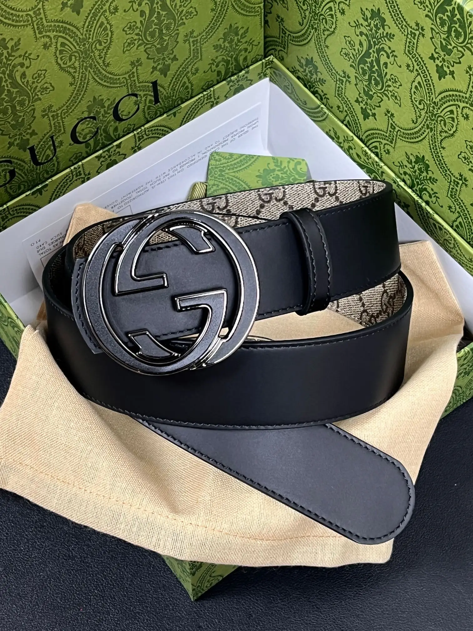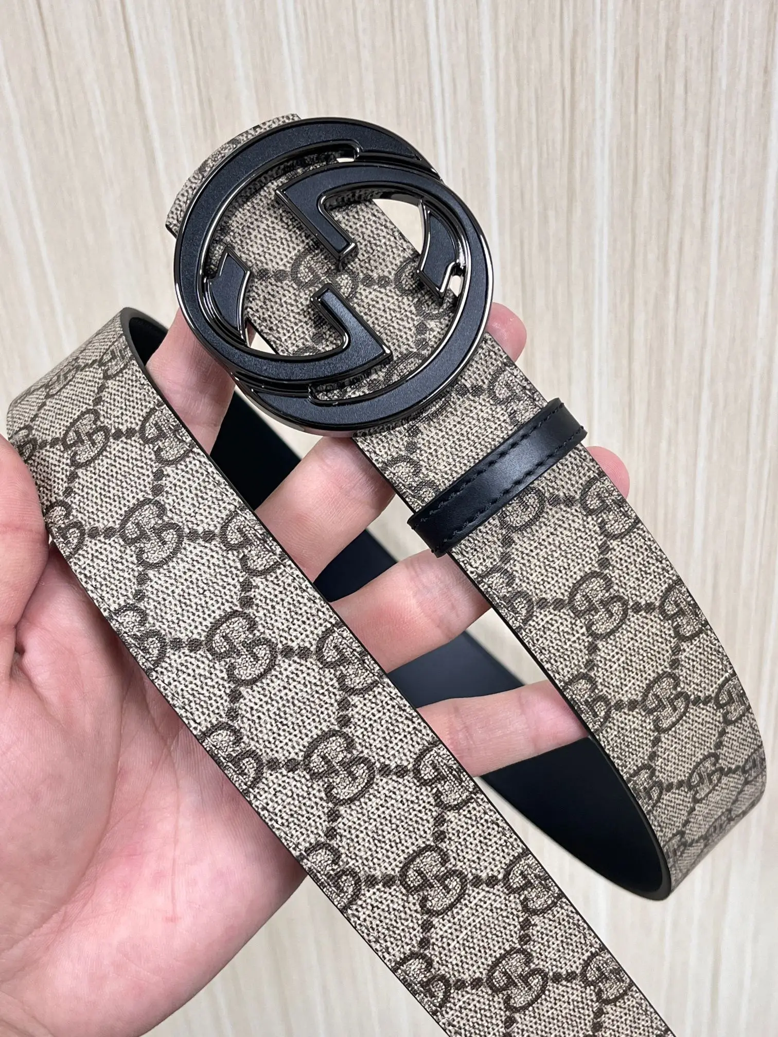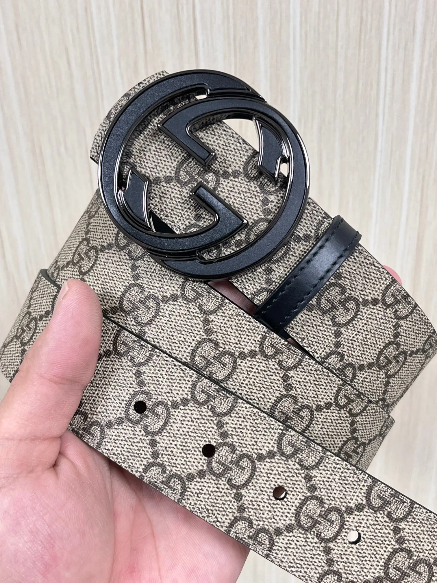 Gucci.古驰这款男士腰带亮眼吸睛 是2026早春系列之一 腰带扣设有一个销钉 可轻松翻转互扣式双G造型配件 一面为柔软GG supreme帆布 另一面为黑色皮革 宽度4cm