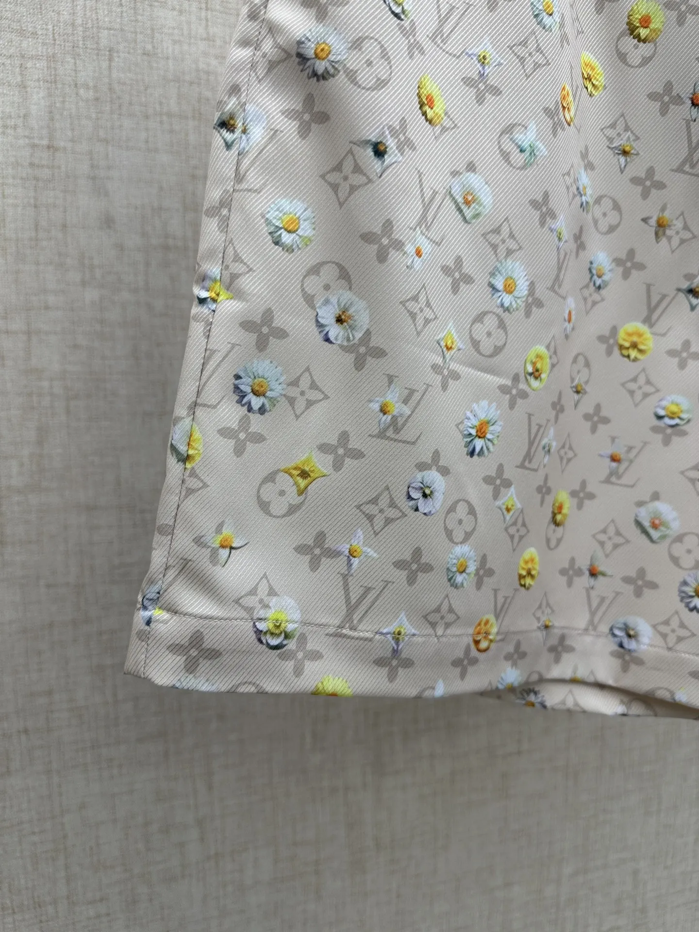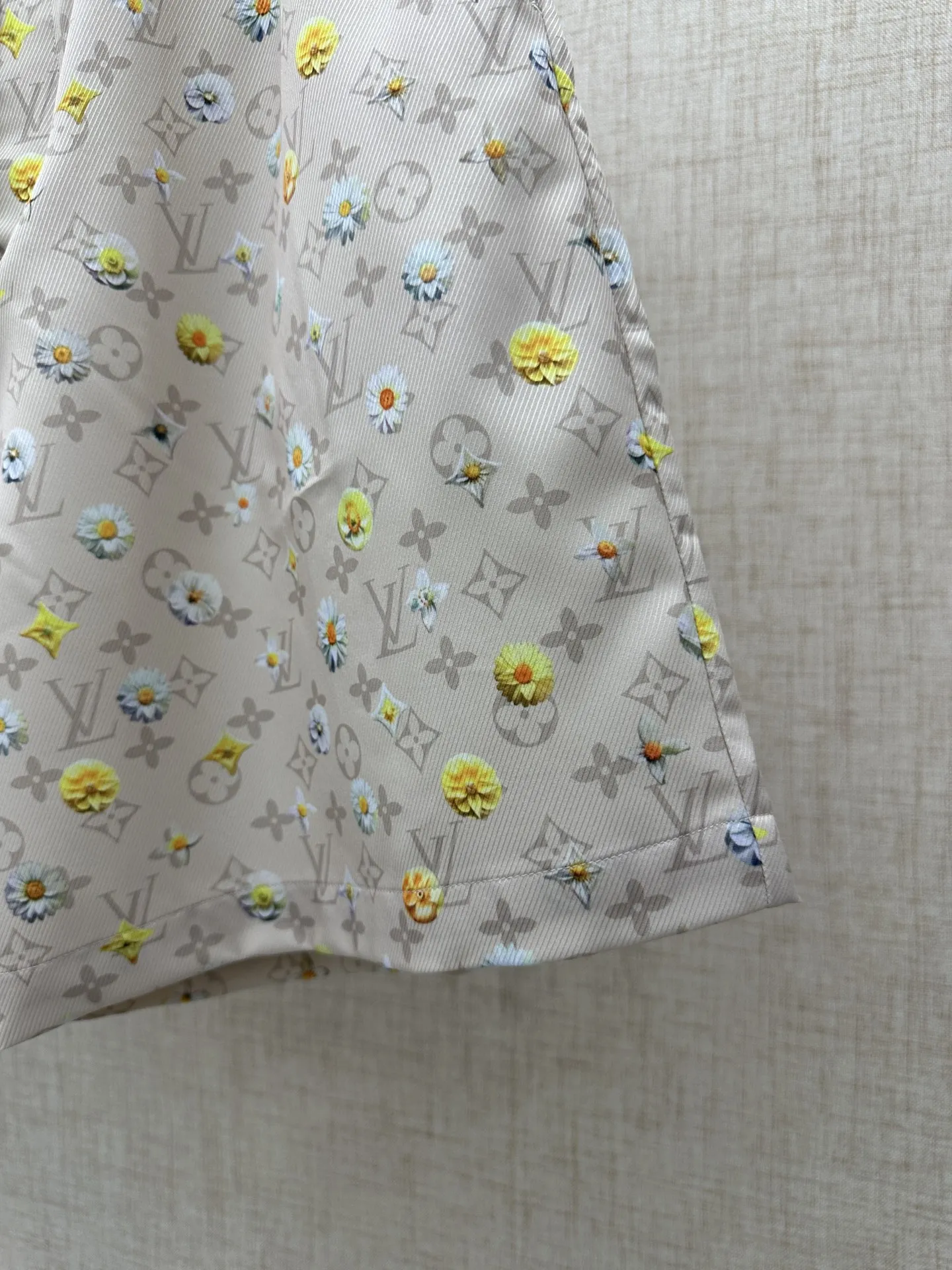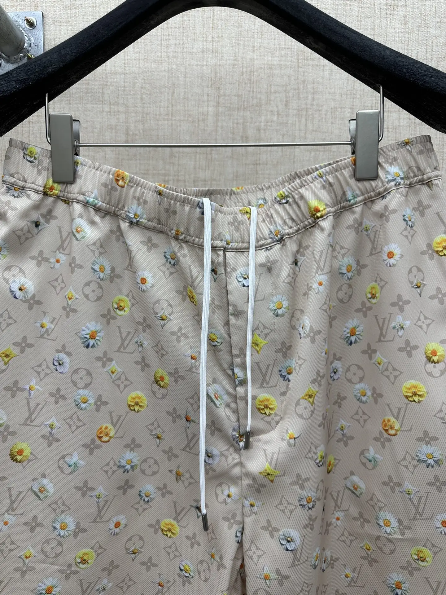 2026 FW 经典Monogram底纹 浅米色底铺陈LV标志性老花暗纹 版型休闲抽绳款 松紧腰设计 细节正面抽绳 后腰拉链口袋 雏菊满印图案 黄 白两色小雏菊错落分布 弱化老花的厚重感 增添清新夏日