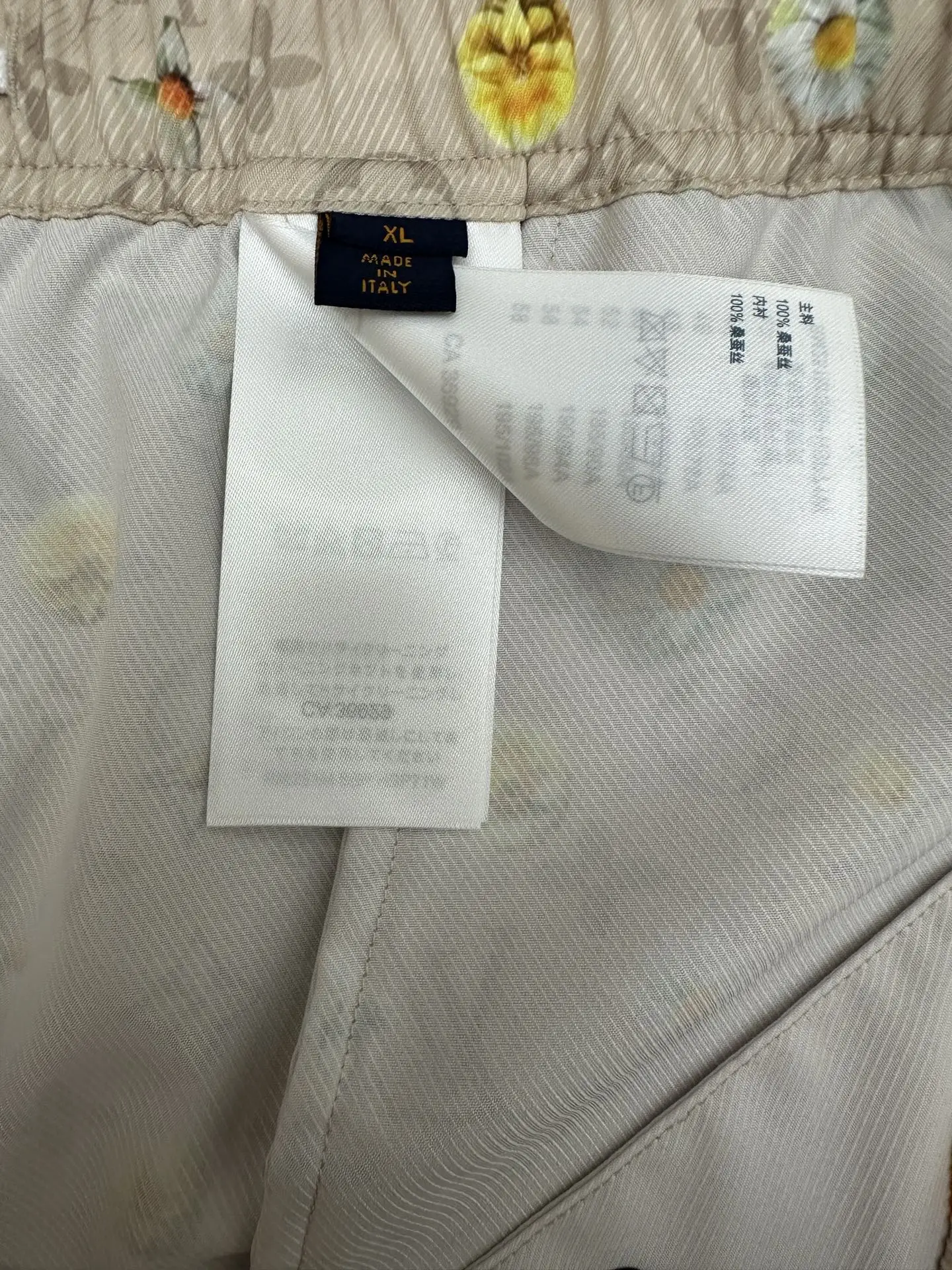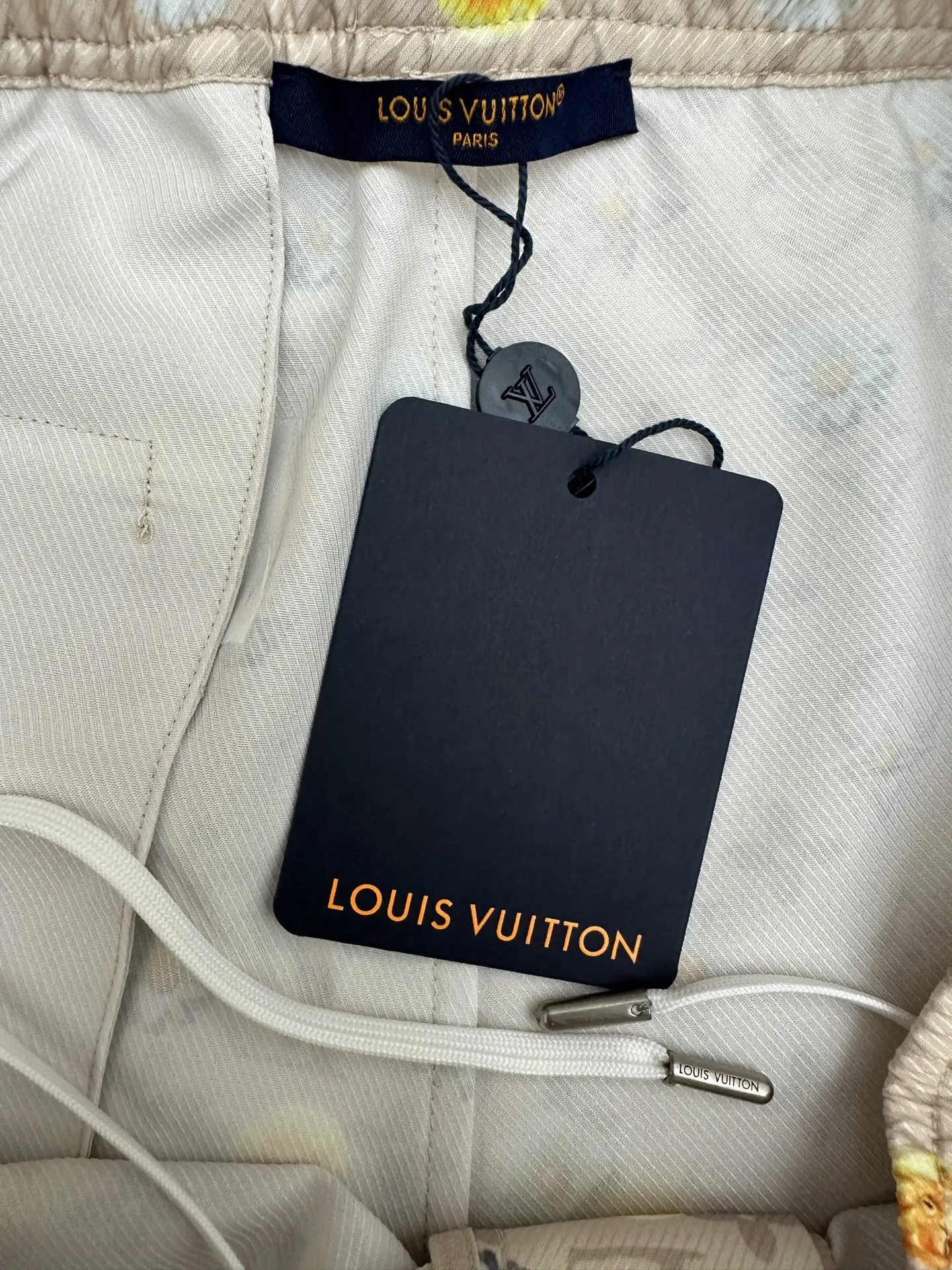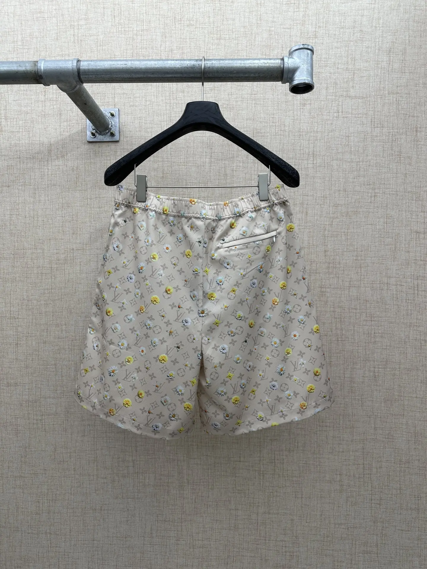 2026 FW 经典Monogram底纹 浅米色底铺陈LV标志性老花暗纹 版型休闲抽绳款 松紧腰设计 细节正面抽绳 后腰拉链口袋 雏菊满印图案 黄 白两色小雏菊错落分布 弱化老花的厚重感 增添清新夏日
