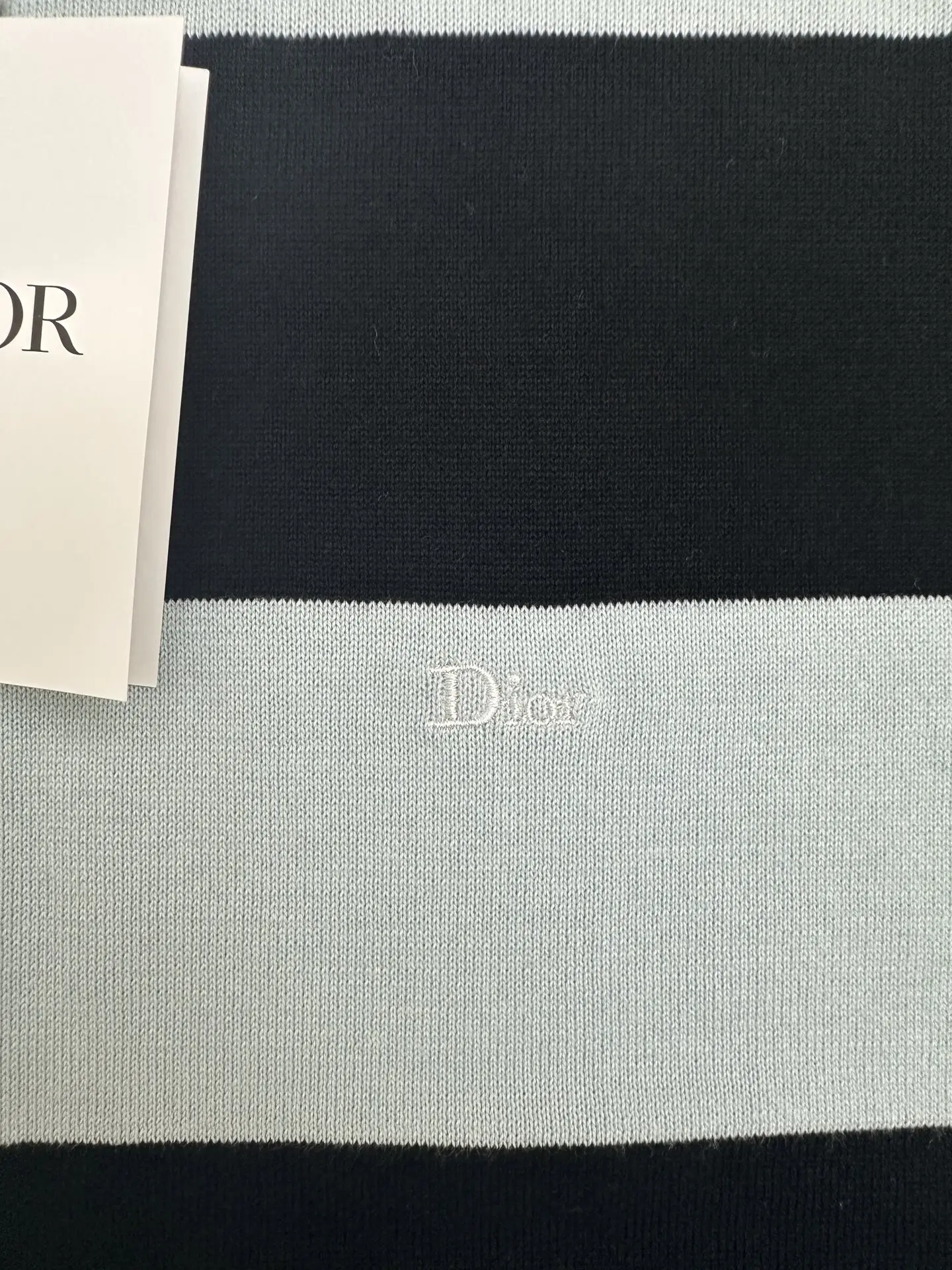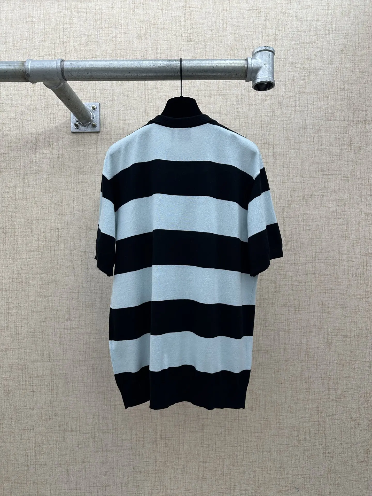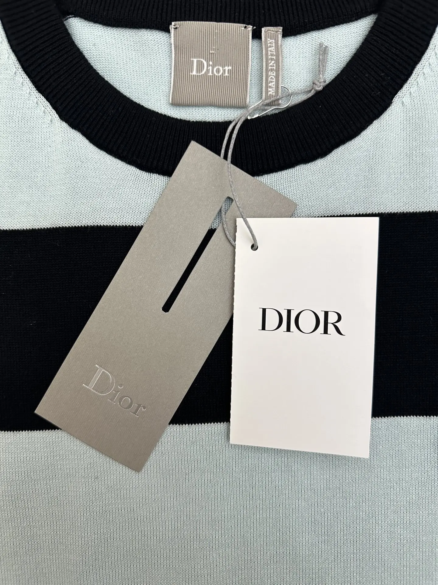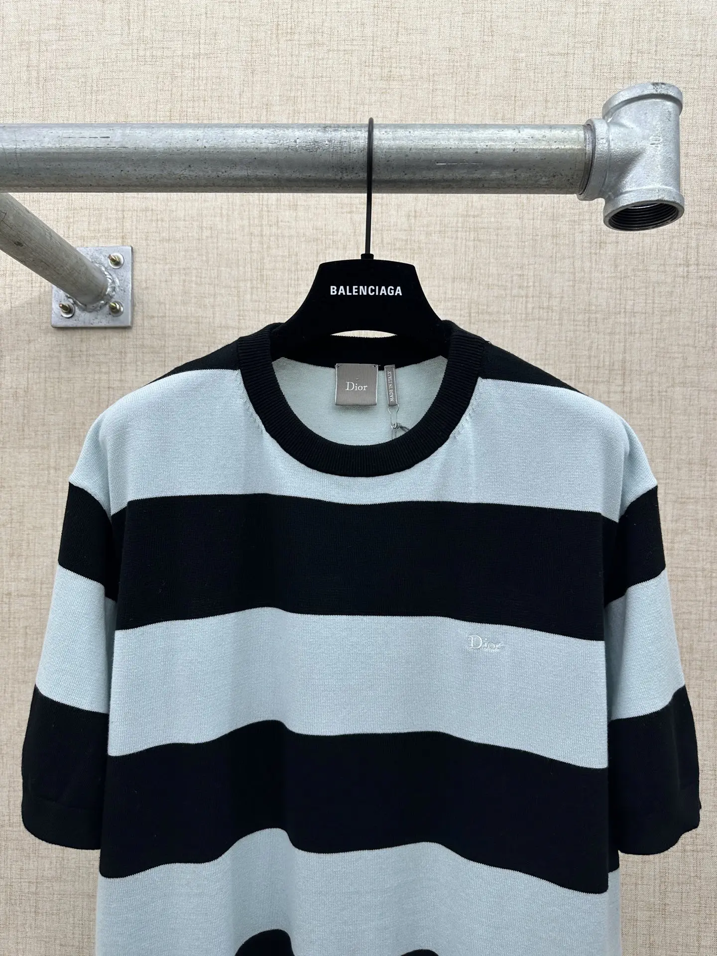 2026 FW 迪奥夏季新款圆领短袖针织衫 采用经典宽条纹撞色设计 黑+浅冰蓝配色 简约高级 细节左胸位置有同色系Dior字母刺绣标识 罗纹圆领 袖口与下摆