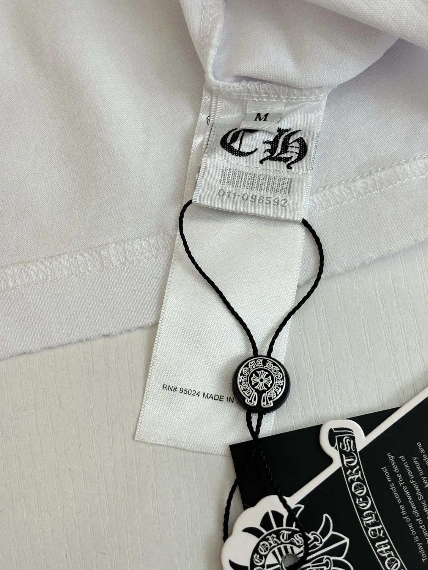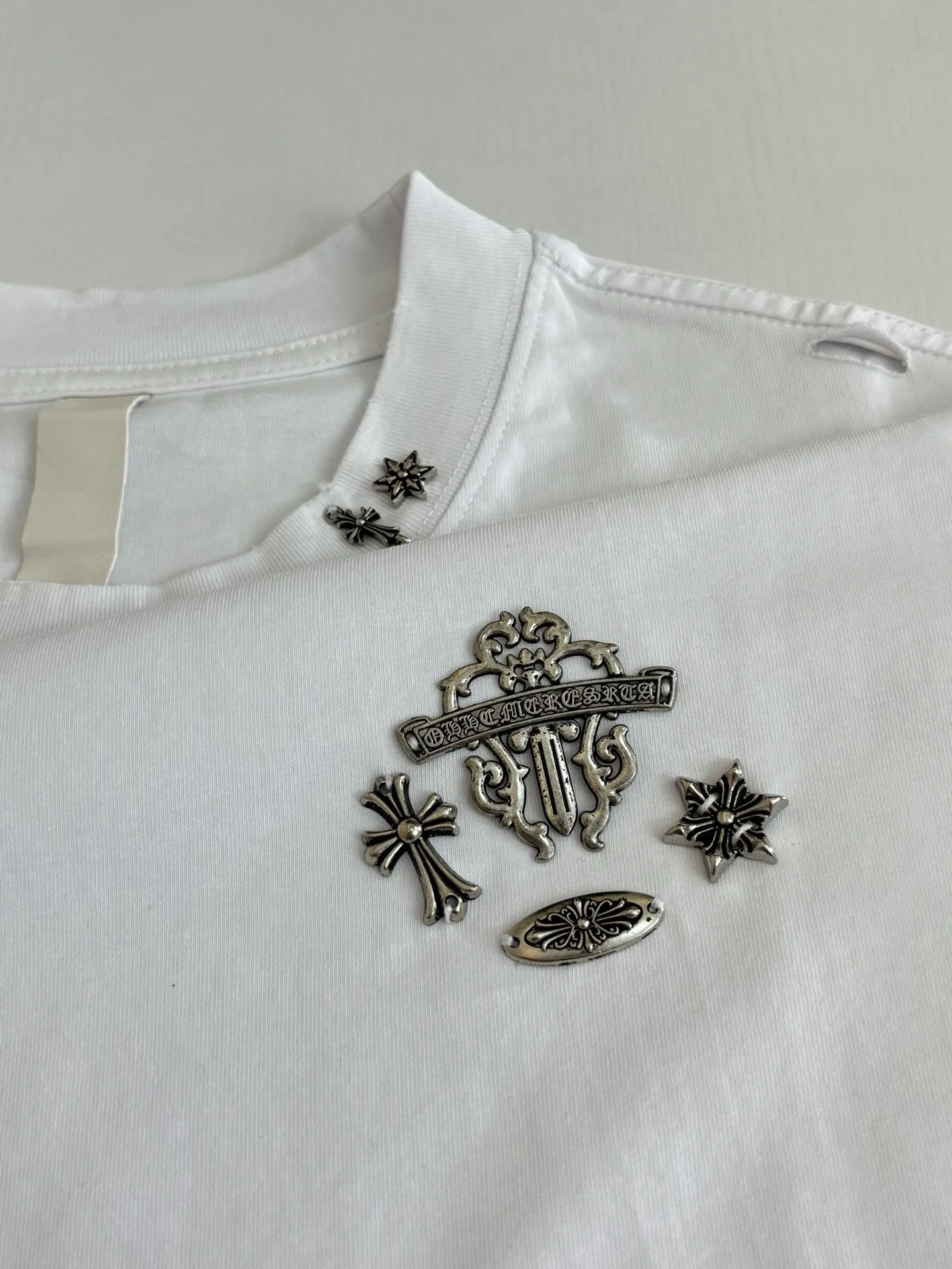 左胸采用品牌经典的十字花+宝剑组合多枚迷你十字银标/皮标 是克罗心最具辨识度的哥特式设计语言 全身做旧破洞 毛边工艺 领口 袖口 下摆 衣身多处做磨损 撕裂效果 强化复古做旧质感